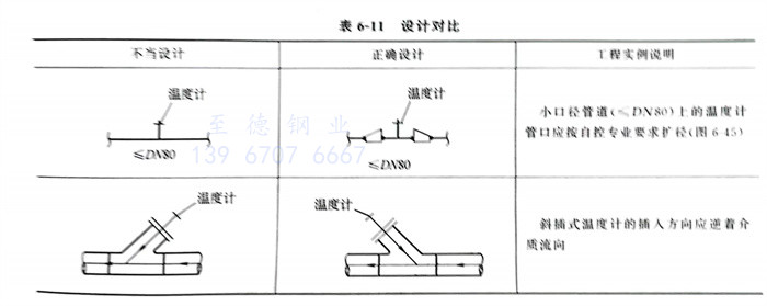 ③. 溫度計(ji)可垂直安(an)裝(zhuang)或傾(qing)斜45°安(an)裝(zhuang),傾(qing)斜45°安(an)裝(zhuang)時(shi),應(ying)與(yu)管內流(liu)體(ti)流(liu)向(xiang)成逆流(liu)接觸(表6-11)。