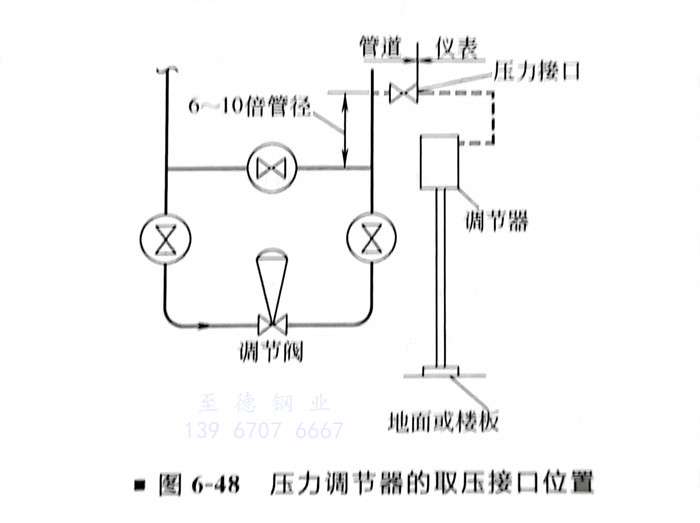 ⑥. 壓力調(diao)(diao)節(jie)器的(de)取(qu)壓接口(kou)應當(dang)布置在距離流(liu)體擾流(liu)元件(jian)如調(diao)(diao)節(jie)閥(fa)、手動閥(fa)、彎頭(tou)等至少6~10倍管徑的(de)地方(圖(tu)6-48)。