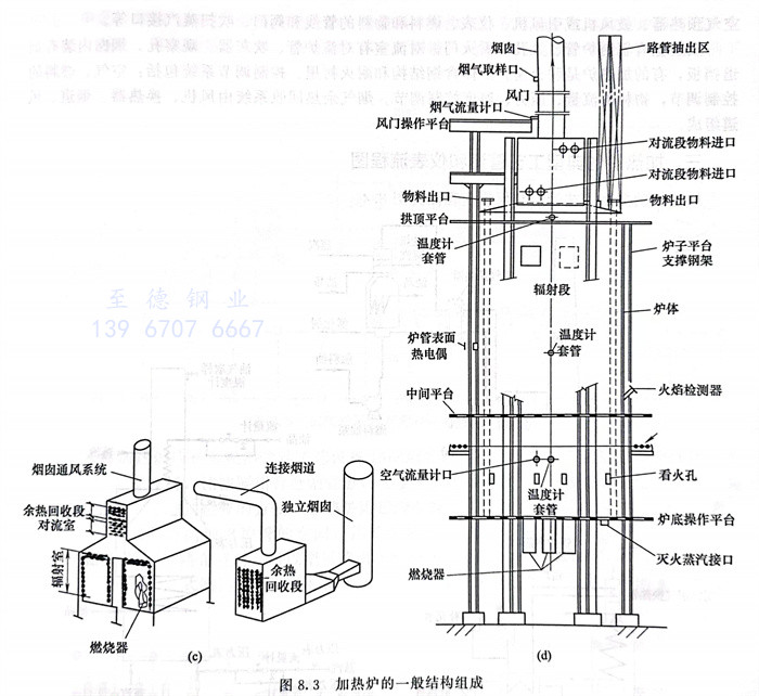 輻(fu)射室(shi)有(you)(you)輻(fu)射爐管、人孔(kong)、看火門(men)。對流室(shi)有(you)(you)對流爐管、吹灰器(qi)、觀(guan)察孔(kong)。煙囪(cong)內裝有(you)(you)煙道(dao)擋板,有(you)(you)的(de)加熱爐是聯合囪(cong)。爐體含鋼結構和(he)耐火襯里。控(kong)(kong)制(zhi)(zhi)調節(jie)系(xi)統包(bao)括:空氣、燃(ran)料的(de)控(kong)(kong)制(zhi)(zhi)調節(jie),物料的(de)流量、壓(ya)力、溫度(du)控(kong)(kong)制(zhi)(zhi)調節(jie)。煙氣余熱回收系(xi)統由風機、換熱器(qi)、煙道(dao)、風道(dao)組成。