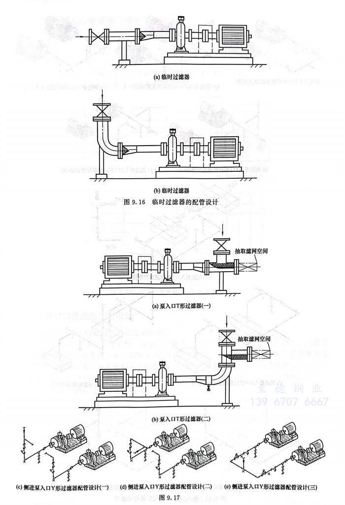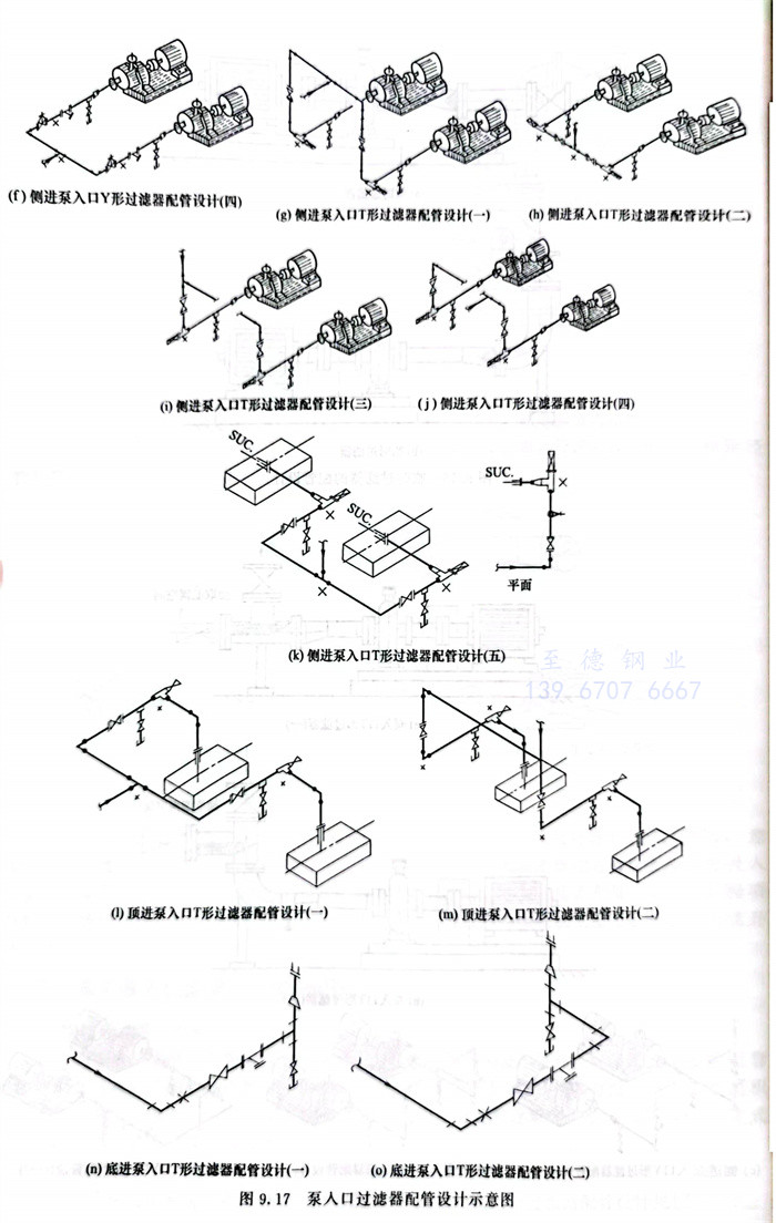 泵入口(kou)永(yong)久(jiu)過濾(lv)器通常用Y形或T形過濾(lv)器,典型的泵入口(kou)過濾(lv)器配(pei)管(guan)設計見圖(tu)9.17。