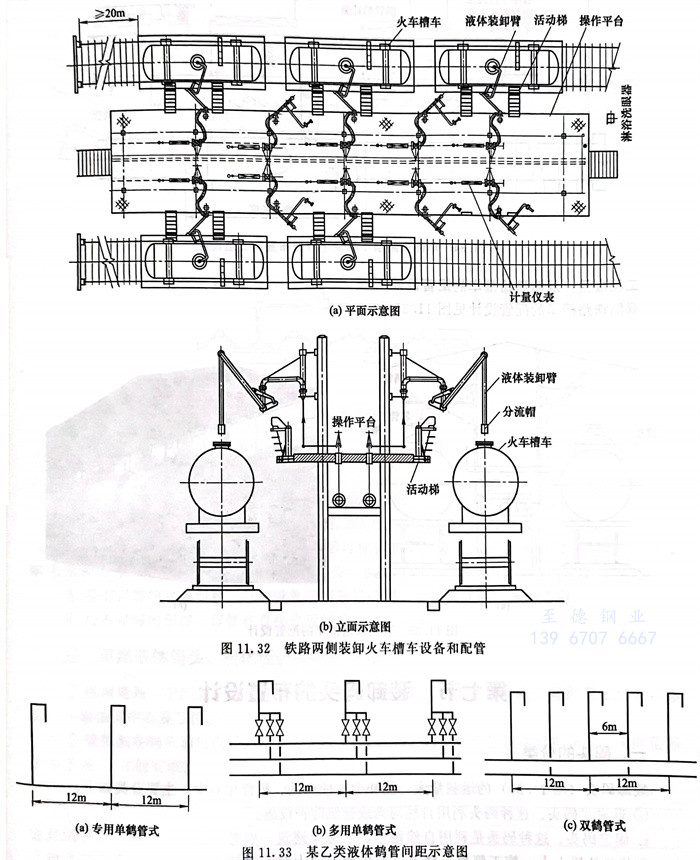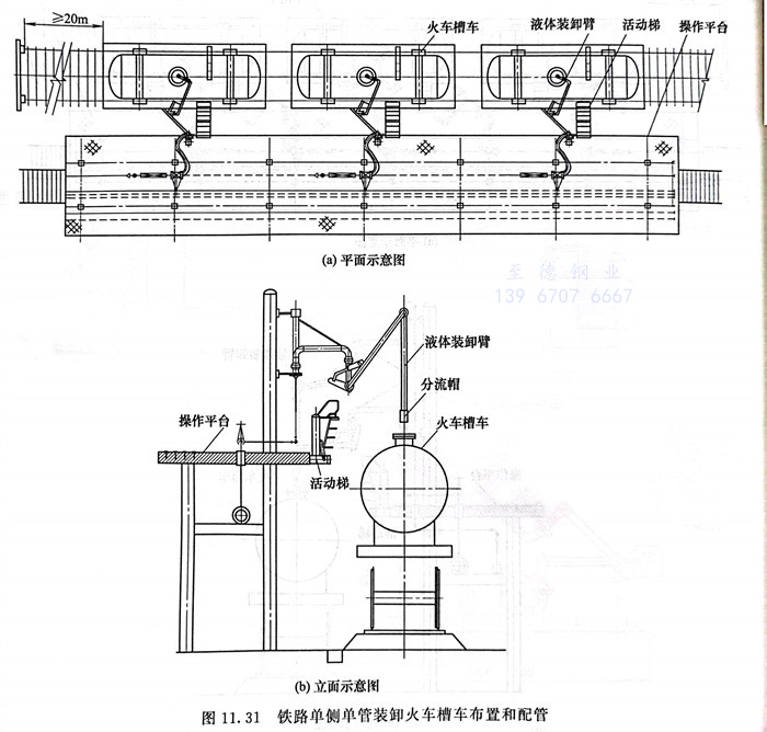 鐵(tie)路(lu)單(dan)(dan)側(ce)(ce)雙管(guan)裝卸(xie)(xie)火車(che)槽車(che)布(bu)置和(he)配(pei)管(guan)見(jian)圖(tu)11.30。鐵(tie)路(lu)單(dan)(dan)側(ce)(ce)單(dan)(dan)管(guan)裝卸(xie)(xie)火車(che)槽車(che)布(bu)置和(he)配(pei)管(guan)見(jian)圖(tu)11.31。鐵(tie)路(lu)兩側(ce)(ce)裝卸(xie)(xie)火車(che)槽車(che)設(she)備(bei)和(he)配(pei)管(guan)見(jian)圖(tu)11.32。