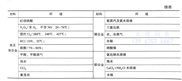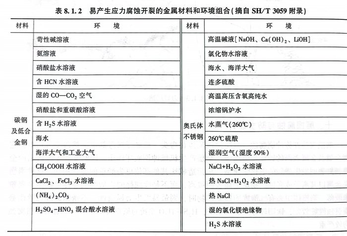 應(ying)力的來源,對于(yu)管(guan)道來說,焊接、冷加工及安裝時殘余應(ying)力是主(zhu)要的。并不是任(ren)何(he)金(jin)屬(shu)與介質的共同(tong)作(zuo)用都引起(qi)應(ying)力腐(fu)蝕破裂(lie)。其中金(jin)屬(shu)材料(liao)只有在某些特(te)定的腐(fu)蝕環境(jing)(jing)中,才發生應(ying)力腐(fu)蝕破裂(lie)。表8.1.2是容易引起(qi)應(ying)力腐(fu)蝕破裂(lie)的管(guan)道金(jin)屬(shu)材料(liao)和腐(fu)蝕環境(jing)(jing)的組合。