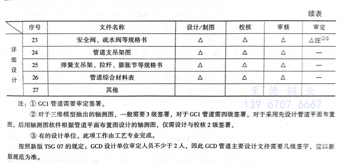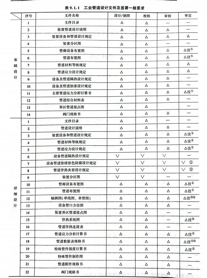 管道(dao)專業(ye)設(she)計(ji)(ji)(ji)(ji)文件及簽(qian)(qian)署(shu)(shu)要求(qiu)(qiu)見國家和(he)行業(ye)標(biao)準規定,各設(she)計(ji)(ji)(ji)(ji)單(dan)位可能不同。根據規范要求(qiu)(qiu)文件目錄和(he)管道(dao)布(bu)置(zhi)圖需(xu)要蓋設(she)計(ji)(ji)(ji)(ji)單(dan)位壓力(li)管道(dao)印(yin)章。工業(ye)管道(dao)設(she)計(ji)(ji)(ji)(ji)文件及簽(qian)(qian)署(shu)(shu)一般(ban)要求(qiu)(qiu)見表9.1.1。浙江至德鋼業(ye)有限公司技術人員(yuan)考察(cha)了(le)(le)國外一些(xie)設(she)計(ji)(ji)(ji)(ji)單(dan)位的管道(dao)設(she)計(ji)(ji)(ji)(ji)文件及簽(qian)(qian)署(shu)(shu)要求(qiu)(qiu),為了(le)(le)保證設(she)計(ji)(ji)(ji)(ji)質(zhi)量,對壓力(li)管道(dao)設(she)計(ji)(ji)(ji)(ji)文件的深度及多級簽(qian)(qian)署(shu)(shu)要求(qiu)(qiu)均非(fei)常嚴格,例如,有的國外設(she)計(ji)(ji)(ji)(ji)單(dan)位要求(qiu)(qiu)三(san)維模型抽(chou)出的重(zhong)要管線軸測圖至少(shao)4級校審簽(qian)(qian)署(shu)(shu)。
