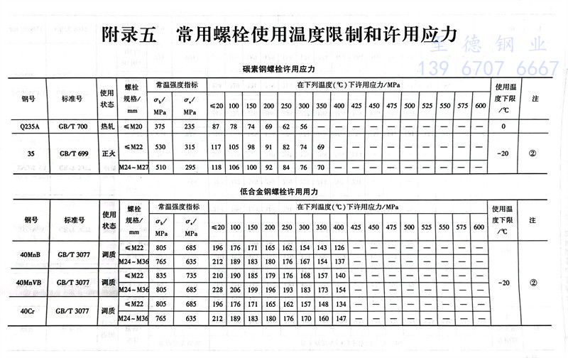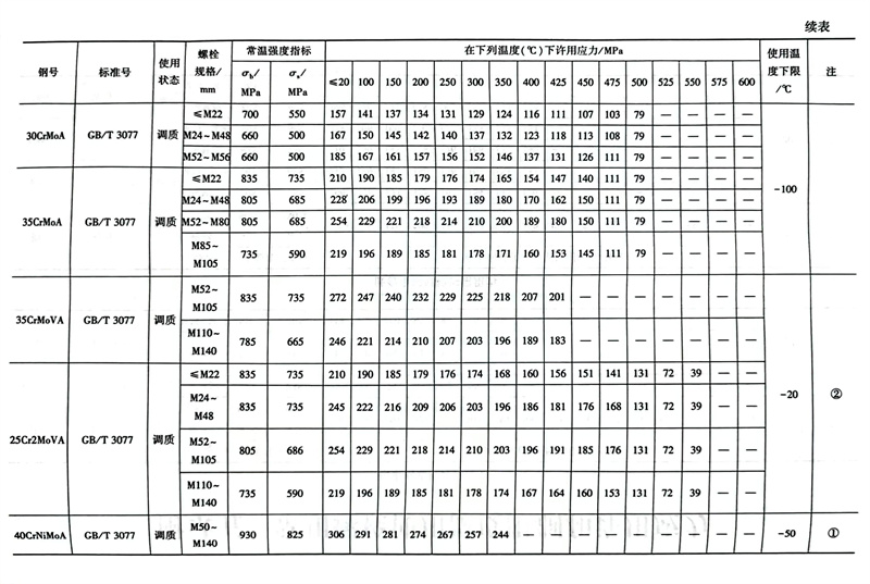 常用螺栓使用溫度限制和許用應力參照表