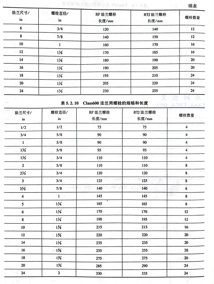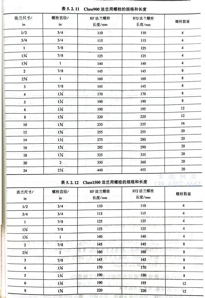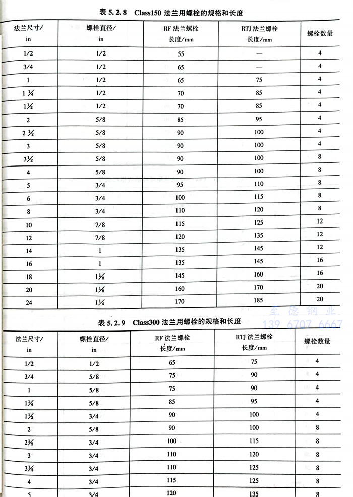 螺栓(shuan)(shuan)長度(du)的取值(zhi)可(ke)從(cong)ASMEB16.5中的推薦值(zhi)來(lai)選擇,但是,還需要考慮螺栓(shuan)(shuan)自身的牙型、施工安(an)裝位置、連接件長度(du)等因素(su)。RF、RTJ法蘭用螺栓(shuan)(shuan)的規格和長度(du),Class150見(jian)(jian)表(biao)5.2.8,Class300見(jian)(jian)表(biao)5.2.9,Class600 見(jian)(jian)表(biao)5.2.10,Class900見(jian)(jian)表(biao)5.2.11,Class1500見(jian)(jian)表(biao)5.2.12,Class2500見(jian)(jian)表(biao)5.2.13。