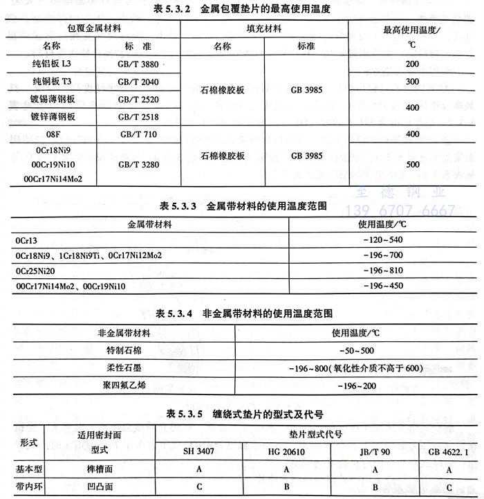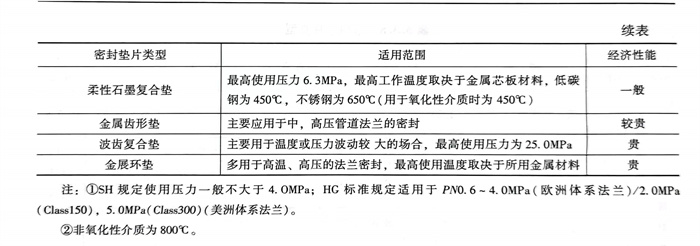 ①. 聚四氟乙烯(xi)包(bao)覆(fu)墊片,一般(ban)用于耐腐蝕介(jie)質、防黏結或介(jie)質要求純度高(gao)(gao)的情(qing)況。其最(zui)高(gao)(gao)公稱壓力為PN5.0,最(zui)高(gao)(gao)工作溫(wen)度為150℃。金屬包(bao)覆(fu)墊片的最(zui)高(gao)(gao)使用溫(wen)度見表5.3.2。墊片標準為SH/T 3402、HG/T 20609和HG/T 20630等。