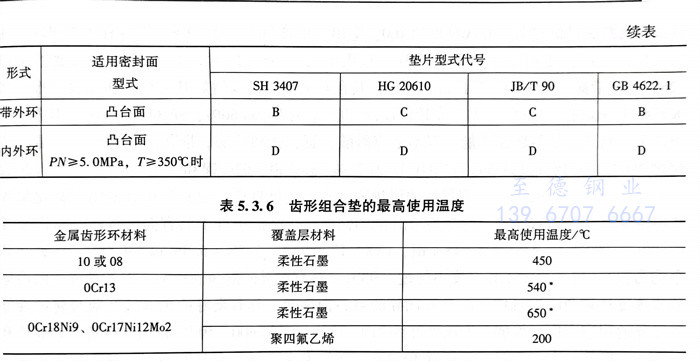 ④. 柔性石墨復合墊由沖齒或沖孔金屬芯板與膨脹石墨粒子復合而成。鋼制管法蘭用齒形組合墊見標準HG/T 20611和HG/T 20632,適用于突面、凹凸面和榫槽面法蘭。齒形組合墊的最高使用溫度見表5.3.6。