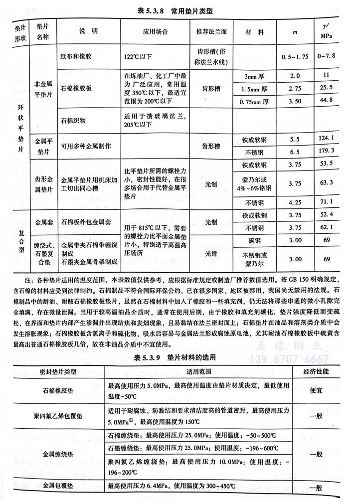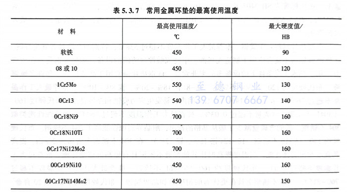 常用金屬環墊(dian)的最高使(shi)用溫度見表(biao)5.3.7。常用墊(dian)片(pian)類(lei)型(xing)見表(biao)5.3.8,墊(dian)片(pian)材料的選用見表(biao)5.3.9。