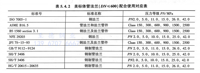 管法蘭配合使用對應表見表5.4.2和表5.4.3,包含連接尺寸、密封面尺寸的配合使用。