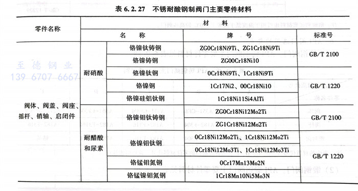 用于公稱壓力(li)PN≤6.4MPa,溫度低于或等(deng)于200℃的硝酸、醋酸等(deng)介質的不銹耐酸鋼制閥門,主要零(ling)件材料按表6.2.27選(xuan)用。