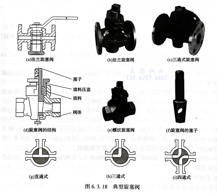 2. 旋塞閥最適(shi)用于(yu)(yu)作為切斷和開啟(qi)以及分(fen)流使用。它易(yi)于(yu)(yu)適(shi)應多通(tong)道結構(gou),以至(zhi)一(yi)(yi)個(ge)閥可(ke)以獲得兩個(ge)、三個(ge)甚(shen)至(zhi)四個(ge)不同的(de)流道,這樣可(ke)以簡化管道系統的(de)設計,減少閥門(men)用量以及設備中需要的(de)一(yi)(yi)些連(lian)接配件。圖(tu)(tu)6.3.18(g)為直(zhi)通(tong)式(shi)(shi),截斷介(jie)(jie)質(zhi);圖(tu)(tu)6.3.18(h)為三通(tong)式(shi)(shi),兩方(fang)通(tong)路(lu),一(yi)(yi)方(fang)關閉(bi),改(gai)(gai)變(bian)介(jie)(jie)質(zhi)方(fang)向(xiang)(xiang)或進行介(jie)(jie)質(zhi)分(fen)配;圖(tu)(tu)6.3.18(i)為四通(tong)式(shi)(shi),改(gai)(gai)變(bian)介(jie)(jie)質(zhi)方(fang)向(xiang)(xiang)或進行介(jie)(jie)質(zhi)分(fen)配。