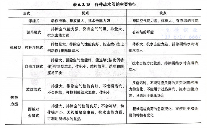 各種疏水閥的主要特征見表6.3.15。