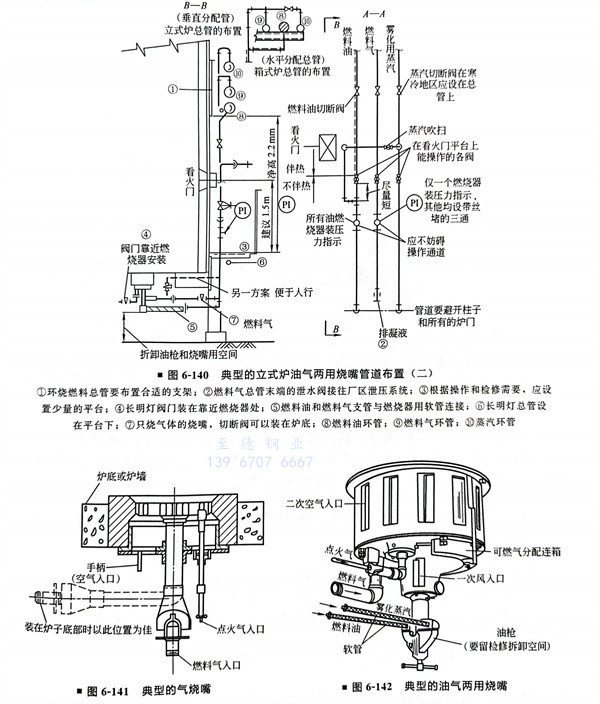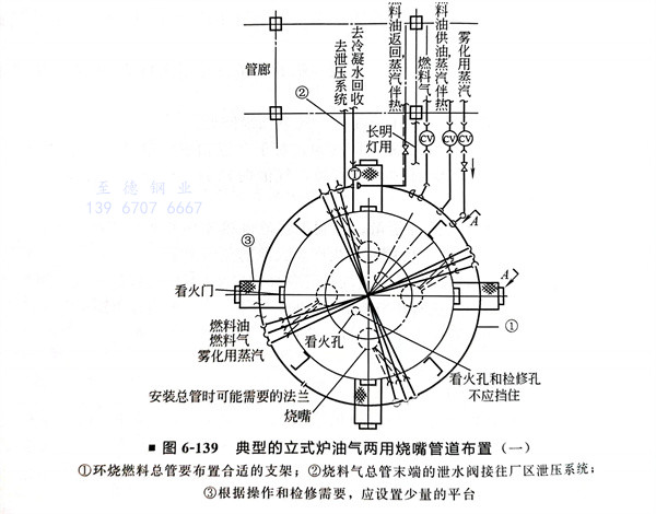 典型的(de)立式爐油氣(qi)兩(liang)用(yong)燒(shao)嘴管道布置如圖6-139、圖6-140所(suo)示。典型的(de)氣(qi)燒(shao)嘴如圖6-141所(suo)示。典型的(de)油氣(qi)兩(liang)用(yong)燒(shao)嘴如圖6-142所(suo)示。