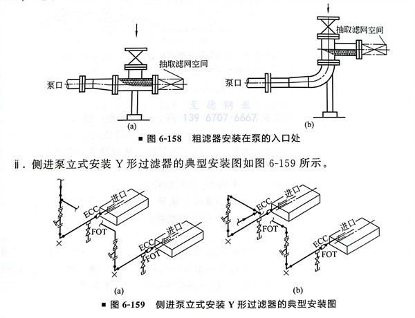 i. 通常用(yong)Y形(xing)或T形(xing)粗濾器,安裝在(zai)泵的(de)入口處,如圖6-158所(suo)示(shi)。