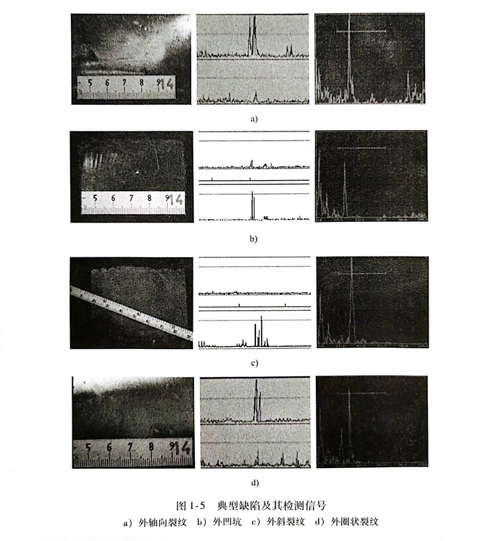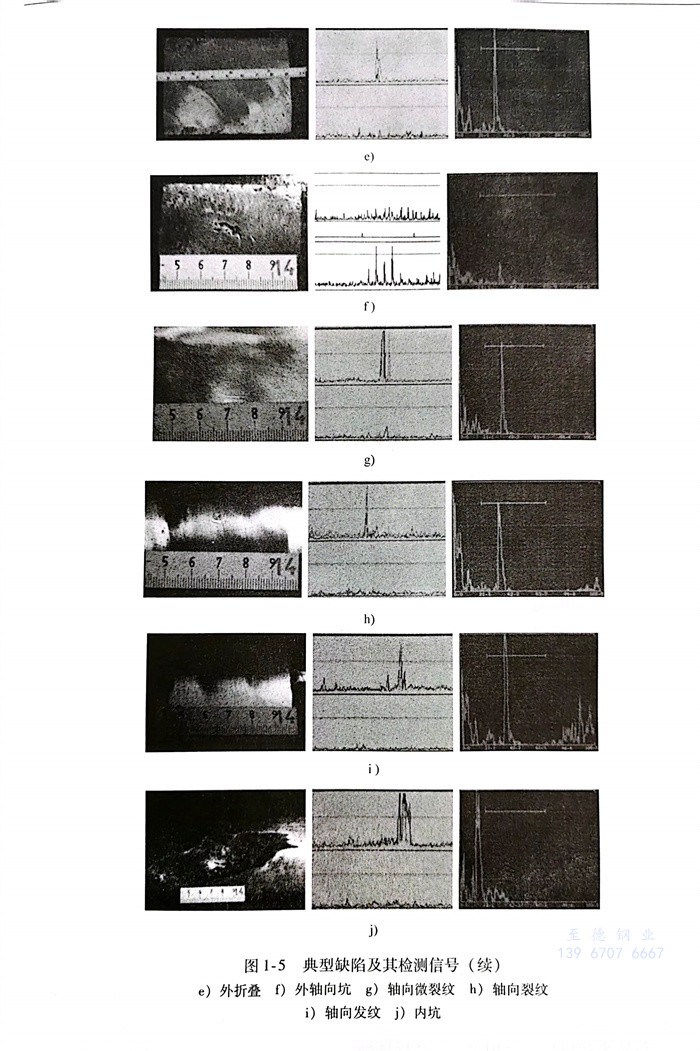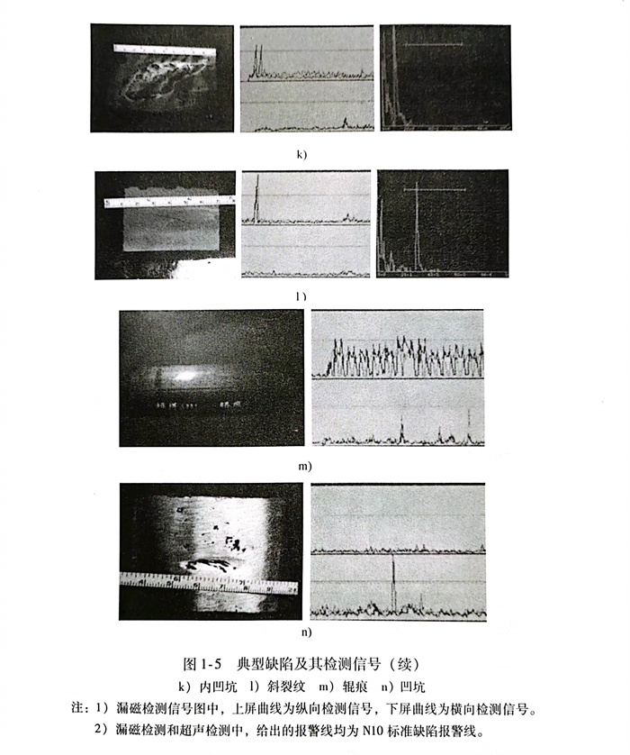 為(wei)直觀體(ti)現,圖1-5給出了不(bu)銹鋼(gang)管檢測過(guo)程中出現過(guo)的多種缺陷(裂紋、缺失)以及相應的漏磁檢測信號(hao)和超聲(sheng)檢測信號(hao),從中能夠(gou)了解自然缺陷的多樣(yang)性和不(bu)同檢測方法的敏感差異。