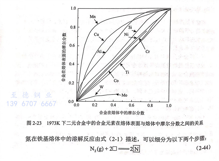 根據 Ono-Nakazato等351的(de)(de)研(yan)(yan)究,在(zai)1973K下二元合(he)金中(zhong)(zhong)(zhong)的(de)(de)合(he)金元素在(zai)熔體表面(mian)與熔體中(zhong)(zhong)(zhong)摩爾分數(shu)之間的(de)(de)關系如圖2-23所示。從中(zhong)(zhong)(zhong)選擇Mn、Cu和Mo等表面(mian)相(xiang)與本(ben)體相(xiang)中(zhong)(zhong)(zhong)摩爾分數(shu)差異較大的(de)(de)合(he)金元素進(jin)行(xing)氣(qi)(qi)相(xiang)滲氮(dan)動力學研(yan)(yan)究,并利用同(tong)位(wei)素交換技術在(zai)1973K下進(jin)行(xing)了實驗,通過(guo)研(yan)(yan)究氣(qi)(qi)相(xiang)滲氮(dan)反應速率常(chang)數(shu)與表面(mian)相(xiang)中(zhong)(zhong)(zhong)摩爾分數(shu)的(de)(de)關系討論了影(ying)響機理。