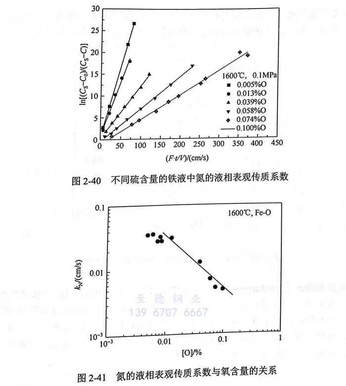 與硫相(xiang)似,氧同樣對鐵液中(zhong)(zhong)的(de)(de)氣(qi)相(xiang)滲(shen)氮(dan)速率(lv)有(you)顯(xian)著影響,并且其阻礙效(xiao)果比硫更強(qiang)。如圖2-39和圖2-40所(suo)示,隨著鐵液中(zhong)(zhong)氧含(han)量的(de)(de)增加,氮(dan)的(de)(de)氣(qi)相(xiang)滲(shen)氮(dan)速率(lv)和氮(dan)的(de)(de)液相(xiang)表(biao)觀傳(chuan)(chuan)質(zhi)系數(shu)明顯(xian)降低。如圖2-41所(suo)示,當Fe-O系鐵液中(zhong)(zhong)氧含(han)量高于0.02%時(shi),氮(dan)的(de)(de)液相(xiang)表(biao)觀傳(chuan)(chuan)質(zhi)系數(shu)值與成(cheng)反比,可見氧對氮(dan)的(de)(de)氣(qi)相(xiang)滲(shen)氮(dan)速率(lv)的(de)(de)影響機理(li)與Fe-S 系鐵液相(xiang)同。因此,Fe-O系鐵液中(zhong)(zhong)氮(dan)的(de)(de)液相(xiang)表(biao)觀傳(chuan)(chuan)質(zhi)速率(lv)由式(2-80)表(biao)示: