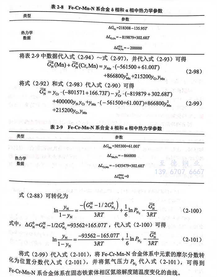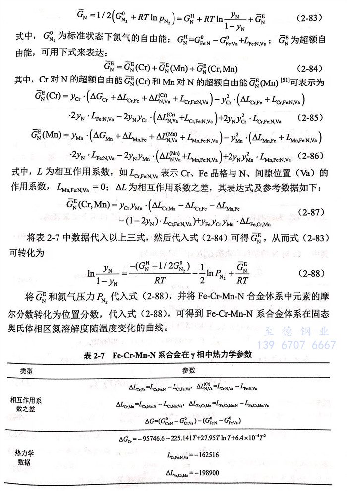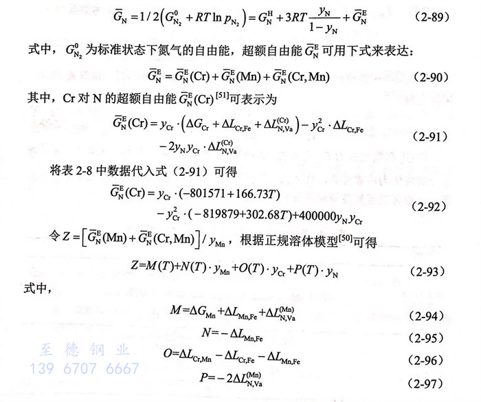 表2-11給出了1000~1200℃范圍內(nei),N與合金元素Cr、Mn的活度(du)相(xiang)互(hu)作用(yong)系(xi)數和溫度(du)之間(jian)的關系(xi)。根(gen)據Wagner模(mo)型,超額(e)吉布(bu)斯自由能可以用(yong)活度(du)相(xiang)互(hu)作用(yong)系(xi)數表示為(wei)