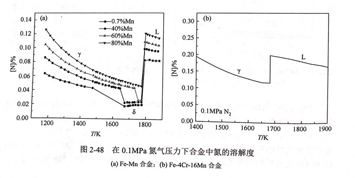 一般而言,不銹(xiu)鋼(gang)熔體在凝固過程中首先生成δ-Fe相,而氮在δ-Fe中的溶解度遠低于在液相和奧氏體相中的溶解度(如圖2-42所示,容易使鋼中的氮析出并形成氮氣孔。因此,探究影響固相中氮溶解度的因素,并建立合理的固相溶解度模型,對高氮不銹鋼(gang)的成分設計和凝固過程的控制具有重要意義。