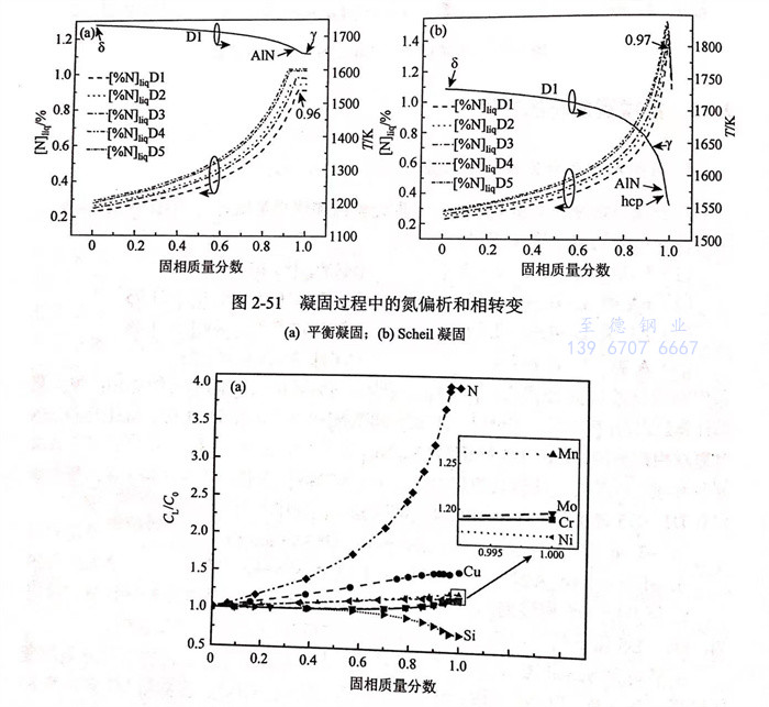 在(zai)(zai)平(ping)衡(heng)(heng)和Scheil凝(ning)(ning)(ning)(ning)固(gu)過程中(zhong),D1~D5鑄錠(ding)內,[%N]uiq隨固(gu)相(xiang)(xiang)(xiang)(xiang)質(zhi)(zhi)(zhi)量(liang)分(fen)(fen)數的變化趨勢完(wan)全一致。以D1為例,對平(ping)衡(heng)(heng)凝(ning)(ning)(ning)(ning)固(gu)而(er)言(yan)[圖(tu)2-51(a)],貧氮(dan)(dan)(dan)相(xiang)(xiang)(xiang)(xiang)(鐵(tie)素體(ti)相(xiang)(xiang)(xiang)(xiang)δ)的不斷形(xing)成[78],導致氮(dan)(dan)(dan)在(zai)(zai)殘余液相(xiang)(xiang)(xiang)(xiang)中(zhong)大(da)量(liang)富(fu)(fu)(fu)集,[%N]iq快(kuai)速(su)(su)增(zeng)大(da),直(zhi)到(dao)固(gu)相(xiang)(xiang)(xiang)(xiang)質(zhi)(zhi)(zhi)量(liang)分(fen)(fen)數達到(dao)0.96左右。隨后(hou),富(fu)(fu)(fu)氮(dan)(dan)(dan)相(xiang)(xiang)(xiang)(xiang)(奧(ao)氏(shi)(shi)體(ti)相(xiang)(xiang)(xiang)(xiang)γ和AIN)持(chi)續形(xing)成,由于(yu)富(fu)(fu)(fu)氮(dan)(dan)(dan)相(xiang)(xiang)(xiang)(xiang)中(zhong)氮(dan)(dan)(dan)的平(ping)衡(heng)(heng)分(fen)(fen)配系數和溶(rong)解度(du)均大(da)于(yu)貧氮(dan)(dan)(dan)相(xiang)(xiang)(xiang)(xiang)[25,771,致使(shi)(shi)[%N]iq的增(zeng)長速(su)(su)率陡降,致使(shi)(shi)[%N]iq在(zai)(zai)隨后(hou)的凝(ning)(ning)(ning)(ning)固(gu)過程中(zhong)幾乎保持(chi)不變。氮(dan)(dan)(dan)、鎳和錳(meng)一起富(fu)(fu)(fu)集在(zai)(zai)富(fu)(fu)(fu)氮(dan)(dan)(dan)相(xiang)(xiang)(xiang)(xiang)γ奧(ao)氏(shi)(shi)體(ti)中(zhong),且(qie)富(fu)(fu)(fu)氮(dan)(dan)(dan)相(xiang)(xiang)(xiang)(xiang)γ奧(ao)氏(shi)(shi)體(ti)中(zhong)氮(dan)(dan)(dan)質(zhi)(zhi)(zhi)量(liang)分(fen)(fen)數明(ming)顯大(da)于(yu)貧氮(dan)(dan)(dan)鐵(tie)素體(ti)相(xiang)(xiang)(xiang)(xiang)δ,差值(zhi)可達0.28%.在(zai)(zai)Scheil凝(ning)(ning)(ning)(ning)固(gu)過程中(zhong),[%N]1iq變化規律如圖(tu)2-51(b)所示,當(dang)固(gu)相(xiang)(xiang)(xiang)(xiang)質(zhi)(zhi)(zhi)量(liang)分(fen)(fen)數小于(yu)0.97時,[%N]iq隨著固(gu)相(xiang)(xiang)(xiang)(xiang)質(zhi)(zhi)(zhi)量(liang)分(fen)(fen)數的增(zeng)加而(er)快(kuai)速(su)(su)增(zeng)大(da),隨后(hou)[%N]iq增(zeng)長速(su)(su)率陡降,同時[%N]iiq也隨之發生(sheng)斷裂(lie)式(shi)下降,明(ming)顯區別于(yu)平(ping)衡(heng)(heng)凝(ning)(ning)(ning)(ning)固(gu)。與平(ping)衡(heng)(heng)凝(ning)(ning)(ning)(ning)固(gu)相(xiang)(xiang)(xiang)(xiang)比,由于(yu)Scheil凝(ning)(ning)(ning)(ning)固(gu)固(gu)相(xiang)(xiang)(xiang)(xiang)無擴散(san),導致氮(dan)(dan)(dan)、錳(meng)、鉻和鉬(mu)在(zai)(zai)殘余液相(xiang)(xiang)(xiang)(xiang)中(zhong)的富(fu)(fu)(fu)集程度(du)明(ming)顯大(da)于(yu)其在(zai)(zai)平(ping)衡(heng)(heng)凝(ning)(ning)(ning)(ning)固(gu)中(zhong)的富(fu)(fu)(fu)集(圖(tu)2-52),促進(jin)了氮(dan)(dan)(dan)化物[密排六方(hcp)相(xiang)(xiang)(xiang)(xiang)]的形(xing)成,進(jin)而(er)致使(shi)(shi)[%N]iq發生(sheng)斷裂(lie)式(shi)下降[圖(tu)2-51(b)]。