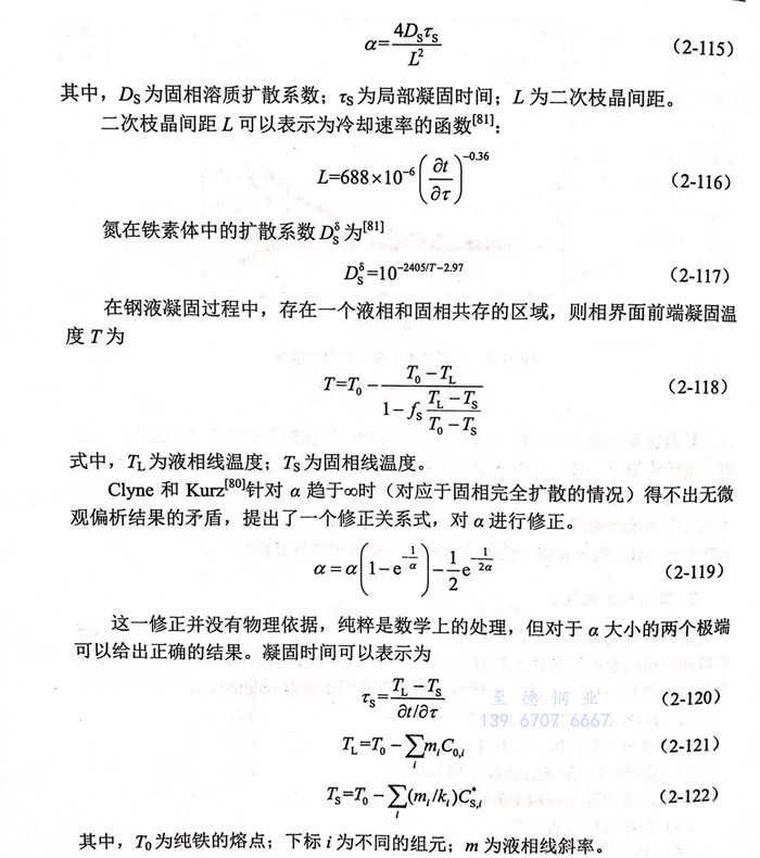 由凝固(gu)參數的(de)表達(da)(da)式(shi)可以看出,a值(zhi)的(de)大小與氮在(zai)該鋼(gang)中的(de)固(gu)相擴散系數、鋼(gang)的(de)固(gu)相線溫度(du)(du)、液相線溫度(du)(du)及冷卻強度(du)(du)有(you)關。對(dui)于(yu)特(te)定的(de)鋼(gang)種(zhong),α值(zhi)是在(zai)一定范圍的(de)。如高氮鋼(gang),α為2~3[82](圖2-54陰(yin)影分),偏(pian)析程(cheng)度(du)(du)Dp可以達(da)(da)到5%,α越小,偏(pian)析越嚴重,在(zai)高氮鋼(gang)熔(rong)煉過程(cheng)中應該盡量避免氮偏(pian)析。但對(dui)于(yu)修正后的(de)α,α值(zhi)的(de)變(bian)化(hua)對(dui)偏(pian)析程(cheng)度(du)(du)影響較小。