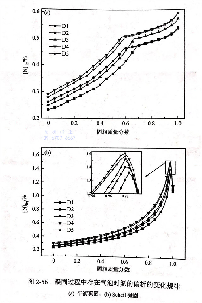 此(ci)外,目前有人(ren)對奧(ao)氏(shi)體鋼(gang)(gang)(gang)凝(ning)固(gu)過(guo)程(cheng)(cheng)中(zhong)(zhong)(zhong)(zhong)(zhong)氮(dan)(dan)氣(qi)(qi)(qi)(qi)孔的形(xing)成(cheng)進行(xing)了(le)大(da)(da)量研(yan)究(jiu),如Yang和Leel901研(yan)究(jiu)了(le)奧(ao)氏(shi)體鋼(gang)(gang)(gang)16Cr3NixMn(x=9和11)凝(ning)固(gu)過(guo)程(cheng)(cheng)中(zhong)(zhong)(zhong)(zhong)(zhong)壓(ya)力和初始(shi)(shi)氮(dan)(dan)質量分(fen)數等因素(su)對氮(dan)(dan)氣(qi)(qi)(qi)(qi)孔形(xing)成(cheng)的影響規(gui)律(lv),并(bing)建立了(le)相(xiang)應的預測模型。Ridolfi和Tassal[84]分(fen)析了(le)氮(dan)(dan)偏析、合(he)金元素(su)、冷(leng)卻(que)速(su)率以(yi)(yi)及枝晶間距對奧(ao)氏(shi)體鋼(gang)(gang)(gang)中(zhong)(zhong)(zhong)(zhong)(zhong)氮(dan)(dan)氣(qi)(qi)(qi)(qi)孔的影響規(gui)律(lv),并(bing)揭示了(le)奧(ao)氏(shi)體鋼(gang)(gang)(gang)中(zhong)(zhong)(zhong)(zhong)(zhong)氮(dan)(dan)氣(qi)(qi)(qi)(qi)孔形(xing)成(cheng)機理。然而(er),目前對于(yu)雙相(xiang)鋼(gang)(gang)(gang)中(zhong)(zhong)(zhong)(zhong)(zhong)氮(dan)(dan)氣(qi)(qi)(qi)(qi)孔形(xing)成(cheng)的研(yan)究(jiu)較(jiao)少,且主(zhu)要集中(zhong)(zhong)(zhong)(zhong)(zhong)在(zai)合(he)金元素(su)、鑄造方式、冷(leng)卻(que)速(su)率等因素(su)對氮(dan)(dan)氣(qi)(qi)(qi)(qi)孔影響規(gui)律(lv)的研(yan)究(jiu),鮮有對雙相(xiang)鋼(gang)(gang)(gang)中(zhong)(zhong)(zhong)(zhong)(zhong)氮(dan)(dan)氣(qi)(qi)(qi)(qi)孔形(xing)成(cheng)機理的報道。以(yi)(yi)21.5Cr5Mn1.5Ni0.25N含氮(dan)(dan)雙相(xiang)鋼(gang)(gang)(gang)為例,氮(dan)(dan)偏析與溶解度(du)的差值(zhi)在(zai)整(zheng)個凝(ning)固(gu)過(guo)程(cheng)(cheng)中(zhong)(zhong)(zhong)(zhong)(zhong)的變化趨(qu)勢,如圖2-59所(suo)示。隨著凝(ning)固(gu)的進行(xing),氮(dan)(dan)偏析始(shi)(shi)終大(da)(da)于(yu)氮(dan)(dan)溶解度(du),且差值(zhi)呈現出(chu)快速(su)增(zeng)大(da)(da)的趨(qu)勢。因此(ci),在(zai)21.5Cr5Mn1.5Ni0.25N 含氮(dan)(dan)雙相(xiang)鋼(gang)(gang)(gang)凝(ning)固(gu)過(guo)程(cheng)(cheng)中(zhong)(zhong)(zhong)(zhong)(zhong),氮(dan)(dan)偏析嚴重,殘余液相(xiang)內氮(dan)(dan)氣(qi)(qi)(qi)(qi)泡(pao)形(xing)成(cheng)趨(qu)勢較(jiao)大(da)(da),明顯高于(yu)19Cr14Mn0.9N含氮(dan)(dan)奧(ao)氏(shi)體不銹(xiu)鋼(gang)(gang)(gang)。