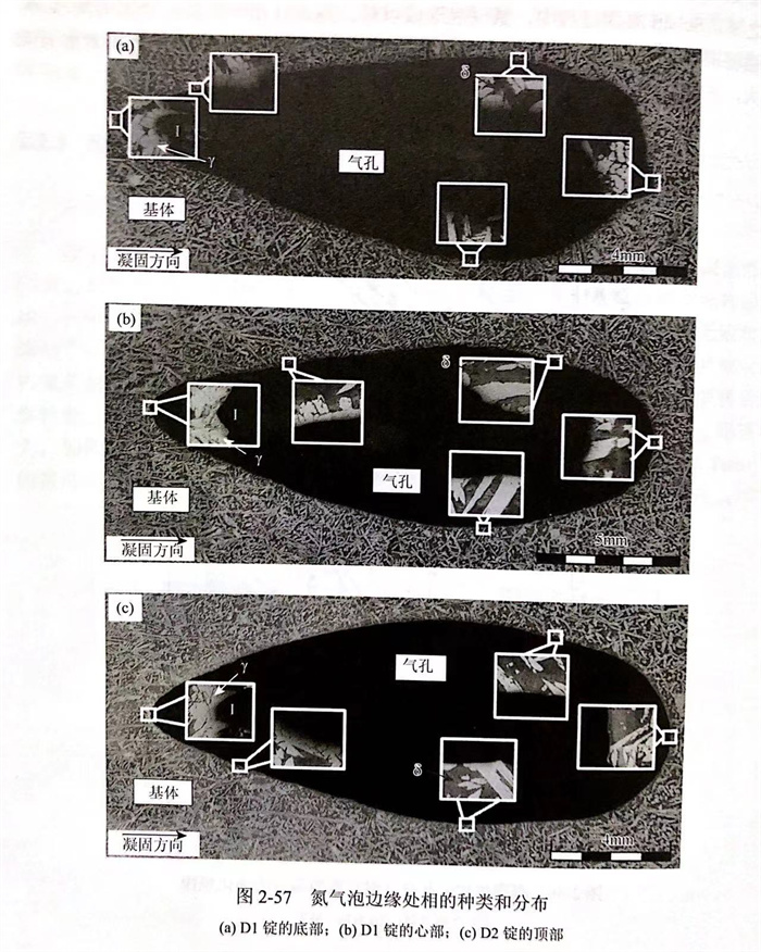 氮(dan)氣孔(kong)沿徑向生長(chang),生長(chang)方向與凝固(gu)(gu)方向一致,那么氮(dan)氣孔(kong)初始形(xing)成(cheng)(cheng)位(wei)(wei)置(zhi)靠近鑄(zhu)錠邊部,且(qie)氮(dan)氣泡(pao)初始位(wei)(wei)置(zhi)邊緣全(quan)由奧氏體(ti)相(xiang)(xiang)(xiang)γ構(gou)成(cheng)(cheng)(圖2-57中I區),與圖2-55描述相(xiang)(xiang)(xiang)符。隨(sui)著氮(dan)氣孔(kong)被(bei)拉長(chang),鐵素體(ti)相(xiang)(xiang)(xiang)和奧氏體(ti)相(xiang)(xiang)(xiang)以(yi)體(ti)積(ji)分數比約為(wei)0.92的(de)關(guan)系交替在(zai)氮(dan)氣泡(pao)周圍形(xing)成(cheng)(cheng),直到氮(dan)氣孔(kong)閉合。凝固(gu)(gu)結(jie)束后(hou),氮(dan)氣孔(kong)的(de)宏觀形(xing)貌類似于橢圓形(xing),與Wei等的(de)研究結(jie)果一致