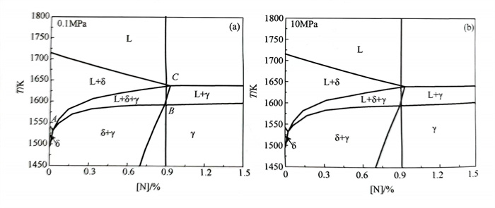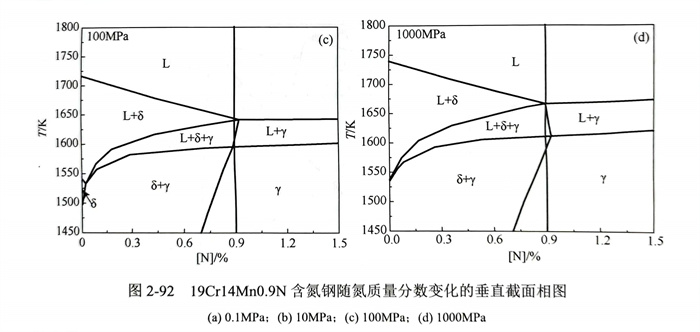 19Cr14Mn0.9N含氮(dan)鋼凝固過程(cheng)中鐵素(su)體(ti)(ti)(ti)(ti)(ti)相(xiang)(xiang)8和奧氏(shi)體(ti)(ti)(ti)(ti)(ti)相(xiang)(xiang)γ的(de)單相(xiang)(xiang)區(qu)(qu)隨壓力(li)的(de)變化規律如(ru)(ru)圖(tu)2-95所(suo)示。當(dang)壓力(li)從(cong)0.1MPa增(zeng)加(jia)(jia)到(dao)100MPa時,δ/(δ+L)相(xiang)(xiang)邊界(jie)變化較小(xiao)(xiao),8/(δ+γ)相(xiang)(xiang)邊界(jie)整體(ti)(ti)(ti)(ti)(ti)向(xiang)高溫端移動(dong),鐵素(su)體(ti)(ti)(ti)(ti)(ti)相(xiang)(xiang)8形成(cheng)區(qu)(qu)域逐漸減小(xiao)(xiao);當(dang)壓力(li)進(jin)一步增(zeng)加(jia)(jia)到(dao)1000MPa時,鐵素(su)體(ti)(ti)(ti)(ti)(ti)相(xiang)(xiang)8單相(xiang)(xiang)區(qu)(qu)幾乎從(cong)隨氮(dan)質量分(fen)數變化的(de)垂直(zhi)截面相(xiang)(xiang)圖(tu)中消(xiao)(xiao)失,如(ru)(ru)圖(tu)2-95(a)所(suo)示,即增(zeng)加(jia)(jia)壓力(li)有(you)助于(yu)鐵素(su)體(ti)(ti)(ti)(ti)(ti)相(xiang)(xiang)δ的(de)消(xiao)(xiao)失[138].而對(dui)于(yu)奧氏(shi)體(ti)(ti)(ti)(ti)(ti)相(xiang)(xiang)γ,隨著壓力(li)的(de)增(zeng)加(jia)(jia),γ/(y+L)相(xiang)(xiang)邊界(jie)向(xiang)高溫段(duan)移動(dong),γ/(δ+γ)相(xiang)(xiang)邊界(jie)整體(ti)(ti)(ti)(ti)(ti)向(xiang)高氮(dan)區(qu)(qu)移動(dong),整個區(qu)(qu)域呈(cheng)增(zeng)大趨勢,如(ru)(ru)圖(tu)2-95(b)所(suo)示。