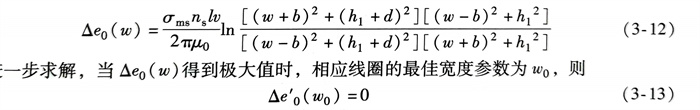 此(ci)外,從圖(tu)3-3中可以看出(chu)(chu),水平(ping)線圈輸出(chu)(chu)感應(ying)(ying)電(dian)(dian)(dian)(dian)動(dong)(dong)(dong)(dong)(dong)勢(shi)(shi)本質為處(chu)于同一提(ti)離(li)高度(du)的(de)前后(hou)導線在同一時(shi)刻的(de)電(dian)(dian)(dian)(dian)動(dong)(dong)(dong)(dong)(dong)勢(shi)(shi)差(cha)動(dong)(dong)(dong)(dong)(dong)輸出(chu)(chu)。因此(ci),感應(ying)(ying)線圈電(dian)(dian)(dian)(dian)動(dong)(dong)(dong)(dong)(dong)勢(shi)(shi)輸出(chu)(chu)與線圈寬(kuan)度(du)有關(guan),并存在最佳寬(kuan)度(du)使得線圈輸出(chu)(chu)最大感應(ying)(ying)電(dian)(dian)(dian)(dian)動(dong)(dong)(dong)(dong)(dong)勢(shi)(shi)。此(ci)時(shi),線圈運動(dong)(dong)(dong)(dong)(dong)至缺(que)陷(xian)中間位置(zhi),并且前沿產(chan)生(sheng)正向極值(zhi)電(dian)(dian)(dian)(dian)動(dong)(dong)(dong)(dong)(dong)勢(shi)(shi)而尾部(bu)產(chan)生(sheng)反向極值(zhi)電(dian)(dian)(dian)(dian)動(dong)(dong)(dong)(dong)(dong)勢(shi)(shi),經過差(cha)動(dong)(dong)(dong)(dong)(dong)后(hou)可獲取最高感應(ying)(ying)電(dian)(dian)(dian)(dian)動(dong)(dong)(dong)(dong)(dong)勢(shi)(shi)輸出(chu)(chu)。根據式(shi)(3-11),當x=0時(shi),可獲得感應(ying)(ying)線圈位于缺(que)陷(xian)中間位置(zhi)時(shi)電(dian)(dian)(dian)(dian)動(dong)(dong)(dong)(dong)(dong)勢(shi)(shi)Δeo與線圈寬(kuan)度(du)參數w的(de)關(guan)系式(shi)Δeo(w),即