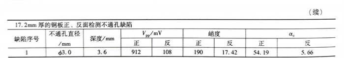 下面(mian)對不同(tong)厚度(du)鋼板中(zhong)不同(tong)深(shen)度(du)的(de)機加工不通(tong)孔進行(xing)檢(jian)測(ce)試驗(yan),其中(zhong)8.0mm厚和(he)17.2mm厚的(de)鋼板正、反(fan)面(mian)檢(jian)測(ce)不通(tong)孔缺(que)陷信號如圖4-17和(he)圖4-18所示,將(jiang)各人工缺(que)陷的(de)試驗(yan)數據及評判(pan)指標計算(suan)列入(ru)表4-5。
