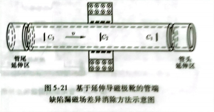 感(gan)(gan)(gan)生(sheng)(sheng)(sheng)磁(ci)場(chang)(chang)(chang)會引起(qi)鋼(gang)(gang)(gang)(gang)(gang)管(guan)(guan)(guan)(guan)(guan)管(guan)(guan)(guan)(guan)(guan)端(duan)磁(ci)化(hua)狀態發(fa)生(sheng)(sheng)(sheng)變(bian)化(hua),進(jin)一(yi)步(bu)導致位于鋼(gang)(gang)(gang)(gang)(gang)管(guan)(guan)(guan)(guan)(guan)管(guan)(guan)(guan)(guan)(guan)頭、管(guan)(guan)(guan)(guan)(guan)體和(he)管(guan)(guan)(guan)(guan)(guan)尾的(de)(de)(de)(de)具有相同尺寸的(de)(de)(de)(de)缺(que)(que)陷(xian)產(chan)(chan)生(sheng)(sheng)(sheng)不(bu)同的(de)(de)(de)(de)漏磁(ci)場(chang)(chang)(chang)強度(du)。如圖5-20所示(shi),在感(gan)(gan)(gan)生(sheng)(sheng)(sheng)磁(ci)場(chang)(chang)(chang)的(de)(de)(de)(de)作用下,位于鋼(gang)(gang)(gang)(gang)(gang)管(guan)(guan)(guan)(guan)(guan)管(guan)(guan)(guan)(guan)(guan)頭、管(guan)(guan)(guan)(guan)(guan)體和(he)管(guan)(guan)(guan)(guan)(guan)尾處(chu)的(de)(de)(de)(de)缺(que)(que)陷(xian)C1C2和(he)C3產(chan)(chan)產(chan)(chan)生(sheng)(sheng)(sheng)的(de)(de)(de)(de)漏磁(ci)場(chang)(chang)(chang)Bc1、Bc2和(he)Bc3的(de)(de)(de)(de)強度(du)依次(ci)增大,為(wei)消(xiao)除(chu)感(gan)(gan)(gan)生(sheng)(sheng)(sheng)磁(ci)場(chang)(chang)(chang)引起(qi)的(de)(de)(de)(de)管(guan)(guan)(guan)(guan)(guan)端(duan)漏磁(ci)場(chang)(chang)(chang)差異(yi),將感(gan)(gan)(gan)生(sheng)(sheng)(sheng)磁(ci)場(chang)(chang)(chang)的(de)(de)(de)(de)影響(xiang)由(you)鋼(gang)(gang)(gang)(gang)(gang)管(guan)(guan)(guan)(guan)(guan)本體轉移到(dao)延(yan)(yan)伸區內。如圖5-21所示(shi),在鋼(gang)(gang)(gang)(gang)(gang)管(guan)(guan)(guan)(guan)(guan)端(duan)部(bu)補充鐵磁(ci)性物質,使鋼(gang)(gang)(gang)(gang)(gang)管(guan)(guan)(guan)(guan)(guan)整體長度(du)向兩端(duan)延(yan)(yan)伸,從(cong)而在端(duan)部(bu)發(fa)生(sheng)(sheng)(sheng)的(de)(de)(de)(de)電磁(ci)感(gan)(gan)(gan)應(ying)現象將轉移到(dao)延(yan)(yan)伸區內。由(you)于延(yan)(yan)伸區的(de)(de)(de)(de)存在,當鋼(gang)(gang)(gang)(gang)(gang)管(guan)(guan)(guan)(guan)(guan)端(duan)部(bu)進(jin)入(ru)(ru)和(he)離(li)開(kai)磁(ci)化(hua)線圈(quan)時,磁(ci)化(hua)線圈(quan)內部(bu)磁(ci)介質總量已基本進(jin)入(ru)(ru)穩定狀態,線圈(quan)磁(ci)通量保持恒定而不(bu)會產(chan)(chan)生(sheng)(sheng)(sheng)感(gan)(gan)(gan)生(sheng)(sheng)(sheng)電流(liu);由(you)于在鋼(gang)(gang)(gang)(gang)(gang)管(guan)(guan)(guan)(guan)(guan)進(jin)入(ru)(ru)區和(he)離(li)開(kai)區同時產(chan)(chan)生(sheng)(sheng)(sheng)反向的(de)(de)(de)(de)感(gan)(gan)(gan)生(sheng)(sheng)(sheng)渦(wo)(wo)流(liu)磁(ci)場(chang)(chang)(chang),從(cong)而減弱了單一(yi)方向感(gan)(gan)(gan)生(sheng)(sheng)(sheng)渦(wo)(wo)流(liu)磁(ci)場(chang)(chang)(chang)的(de)(de)(de)(de)劇烈影響(xiang)。將鋼(gang)(gang)(gang)(gang)(gang)管(guan)(guan)(guan)(guan)(guan)端(duan)部(bu)進(jin)行延(yan)(yan)伸之后(hou),管(guan)(guan)(guan)(guan)(guan)端(duan)缺(que)(que)陷(xian)漏磁(ci)場(chang)(chang)(chang)差異(yi)與管(guan)(guan)(guan)(guan)(guan)體相似,僅存在鋼(gang)(gang)(gang)(gang)(gang)管(guan)(guan)(guan)(guan)(guan)進(jin)入(ru)(ru)區和(he)離(li)開(kai)區產(chan)(chan)生(sheng)(sheng)(sheng)的(de)(de)(de)(de)感(gan)(gan)(gan)生(sheng)(sheng)(sheng)渦(wo)(wo)流(liu)磁(ci)場(chang)(chang)(chang),因(yin)此可采用管(guan)(guan)(guan)(guan)(guan)體缺(que)(que)陷(xian)漏磁(ci)場(chang)(chang)(chang)差異(yi)消(xiao)除(chu)方法進(jin)一(yi)步(bu)處(chu)理(li)。