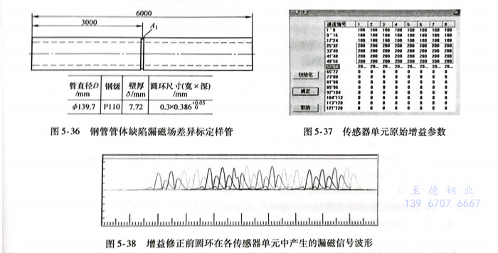 在(zai)基于陣列(lie)傳(chuan)感(gan)(gan)單(dan)(dan)元(yuan)(yuan)(yuan)增益修(xiu)正(zheng)的(de)管體漏磁(ci)(ci)(ci)場差(cha)異(yi)消除方法(fa)中(zhong),刻制有(you)(you)標(biao)定(ding)圓(yuan)環的(de)鋼(gang)管以穩定(ding)速度(du)(du)通過檢測探頭時,標(biao)定(ding)信(xin)號源(yuan)具有(you)(you)單(dan)(dan)一性并(bing)能夠一次(ci)性遍歷(li)每個傳(chuan)感(gan)(gan)器單(dan)(dan)元(yuan)(yuan)(yuan)。由于感(gan)(gan)生渦流磁(ci)(ci)(ci)場的(de)作(zuo)用(yong)使得管體形成了非均(jun)勻(yun)的(de)磁(ci)(ci)(ci)感(gan)(gan)應強度(du)(du),從而導(dao)致圓(yuan)環在(zai)經過不(bu)同(tong)(tong)(tong)傳(chuan)感(gan)(gan)器單(dan)(dan)元(yuan)(yuan)(yuan)時產生的(de)漏磁(ci)(ci)(ci)信(xin)號幅值存在(zai)差(cha)異(yi)。在(zai)對(dui)自然管進行(xing)檢測之(zhi)前,先利(li)用(yong)帶有(you)(you)標(biao)定(ding)圓(yuan)環的(de)樣管對(dui)傳(chuan)感(gan)(gan)器單(dan)(dan)元(yuan)(yuan)(yuan)增益進行(xing)修(xiu)正(zheng),并(bing)且(qie)必(bi)須保證(zheng)鋼(gang)管檢測速度(du)(du)與(yu)標(biao)定(ding)速度(du)(du)相同(tong)(tong)(tong)。最終,采用(yong)標(biao)定(ding)圓(yuan)環作(zuo)為勵磁(ci)(ci)(ci)源(yuan)來修(xiu)正(zheng)傳(chuan)感(gan)(gan)器單(dan)(dan)元(yuan)(yuan)(yuan)的(de)增益,可有(you)(you)效消除同(tong)(tong)(tong)尺(chi)寸缺陷在(zai)管體不(bu)同(tong)(tong)(tong)位(wei)置處產生的(de)檢測信(xin)號差(cha)異(yi)。