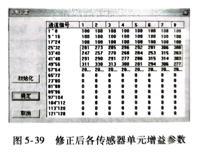 為(wei)消(xiao)除(chu)感(gan)生磁場引起的管體(ti)同(tong)尺(chi)寸缺(que)(que)陷漏磁場差(cha)異,以圓環作為(wei)標定信號(hao)源對陣(zhen)列傳感(gan)單(dan)元(yuan)增益(yi)進行修(xiu)(xiu)正,樣管如(ru)圖(tu)(tu)(tu)5-36所(suo)(suo)示。檢測信號(hao)系(xi)統共(gong)32個(ge)(ge)通(tong)(tong)(tong)道(dao)(dao)(dao),初始采集(ji)時(shi)(shi)各通(tong)(tong)(tong)道(dao)(dao)(dao)增益(yi)統一(yi)(yi)設置為(wei)200,如(ru)圖(tu)(tu)(tu)5-37所(suo)(suo)示。當樣管以速(su)度1.0m/s通(tong)(tong)(tong)過(guo)檢測探(tan)頭時(shi)(shi),獲得(de)編(bian)號(hao)25~32八(ba)個(ge)(ge)通(tong)(tong)(tong)道(dao)(dao)(dao)缺(que)(que)陷漏磁信號(hao)波(bo)形,如(ru)圖(tu)(tu)(tu)5-38所(suo)(suo)示,其中(zhong)每一(yi)(yi)條曲線代表一(yi)(yi)個(ge)(ge)通(tong)(tong)(tong)道(dao)(dao)(dao)。從圖(tu)(tu)(tu)中(zhong)可(ke)以看出(chu),標定圓環在各傳感(gan)單(dan)元(yuan)中(zhong)產生的漏磁信號(hao)幅值不同(tong)。進一(yi)(yi)步(bu),將目標信號(hao)幅值Vs設置為(wei)90,根據式(5-12)算法獲得(de)各通(tong)(tong)(tong)道(dao)(dao)(dao)的修(xiu)(xiu)正參數,如(ru)圖(tu)(tu)(tu)5-39所(suo)(suo)示。將標定圓環再次以相同(tong)速(su)度通(tong)(tong)(tong)過(guo)橫向檢測系(xi)統時(shi)(shi)獲得(de)如(ru)圖(tu)(tu)(tu)5-40所(suo)(suo)示的檢測信號(hao),其中(zhong)一(yi)(yi)條曲線為(wei)一(yi)(yi)個(ge)(ge)通(tong)(tong)(tong)道(dao)(dao)(dao)。從圖(tu)(tu)(tu)中(zhong)可(ke)以看出(chu),經過(guo)增益(yi)修(xiu)(xiu)正之(zhi)后,各通(tong)(tong)(tong)道(dao)(dao)(dao)之(zhi)間的缺(que)(que)陷信號(hao)差(cha)異基本得(de)到(dao)消(xiao)除(chu)。