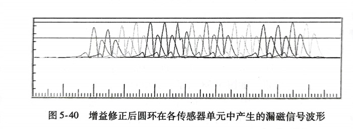 隨著檢測(ce)速度(du)的(de)不(bu)斷提高(gao),不(bu)銹鋼管(guan)離(li)(li)開(kai)區磁(ci)感應強度(du)逐漸大(da)于(yu)進入區,從而導(dao)致(zhi)位(wei)于(yu)離(li)(li)開(kai)區的(de)缺陷(xian)(xian)漏(lou)磁(ci)場(chang)強度(du)大(da)于(yu)位(wei)于(yu)進入區的(de)缺陷(xian)(xian)漏(lou)磁(ci)場(chang)強度(du),感(gan)(gan)(gan)(gan)生(sheng)(sheng)(sheng)磁(ci)場造成處(chu)于不(bu)同空間位置對應傳(chuan)感(gan)(gan)(gan)(gan)器(qi)單元檢(jian)測(ce)到了不(bu)一(yi)致的(de)(de)缺(que)陷漏(lou)(lou)磁(ci)場信(xin)(xin)號(hao)。消(xiao)(xiao)除(chu)管體缺(que)陷漏(lou)(lou)磁(ci)場差異有兩種途徑:一(yi)方面(mian)(mian),可以通過(guo)消(xiao)(xiao)除(chu)鋼管中的(de)(de)感(gan)(gan)(gan)(gan)生(sheng)(sheng)(sheng)渦(wo)流(liu)來消(xiao)(xiao)除(chu)磁(ci)化狀態的(de)(de)差異;另一(yi)方面(mian)(mian),還可采取修正傳(chuan)感(gan)(gan)(gan)(gan)單元的(de)(de)增(zeng)(zeng)益(yi)使(shi)檢(jian)測(ce)信(xin)(xin)號(hao)達到一(yi)致。由(you)于鋼管內產生(sheng)(sheng)(sheng)的(de)(de)感(gan)(gan)(gan)(gan)生(sheng)(sheng)(sheng)渦(wo)流(liu)無法消(xiao)(xiao)除(chu),為此(ci),提出(chu)通過(guo)修正陣列傳(chuan)感(gan)(gan)(gan)(gan)單元增(zeng)(zeng)益(yi)來消(xiao)(xiao)除(chu)同尺寸缺(que)陷產生(sheng)(sheng)(sheng)的(de)(de)漏(lou)(lou)磁(ci)信(xin)(xin)號(hao)差異,如圖5-19所示。