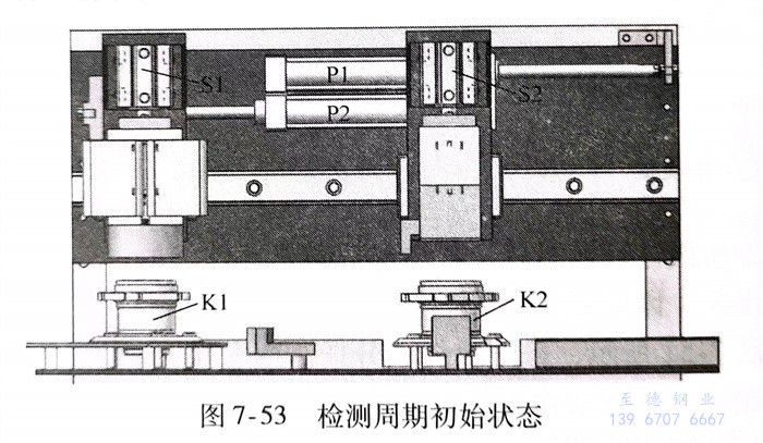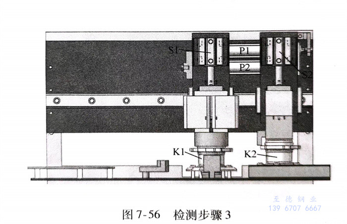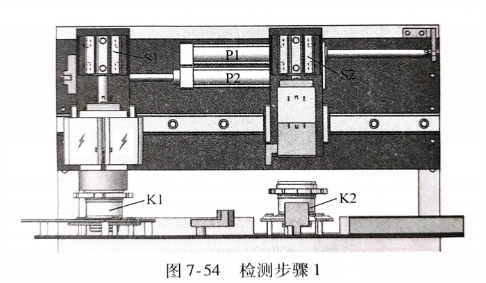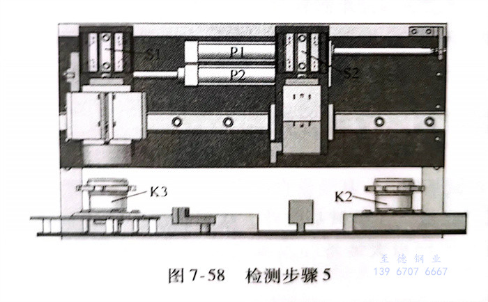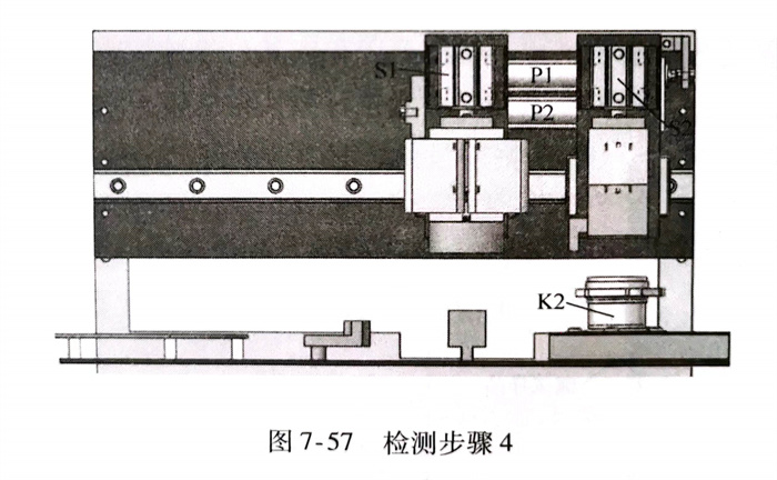 e. 檢測(ce)步(bu)驟5(圖7-58)氣缸(gang)P1和P2伸(shen)展,磁(ci)化(hua)器(qi)和退磁(ci)器(qi)回歸到(dao)原始(shi)位置,下(xia)一個被檢測(ce)的軸承K3被裝填(tian)到(dao)上料工(gong)位,等待下(xia)一個檢測(ce)周期。