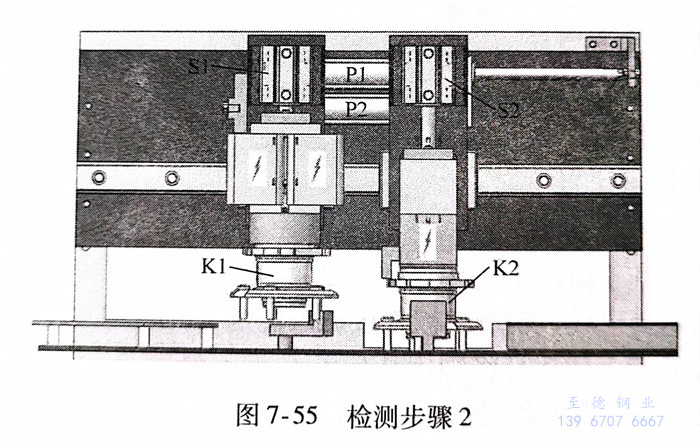 b. 檢測(ce)(ce)步驟2(圖7-55)氣(qi)缸S1收縮(suo),軸(zhou)承(cheng)K1被(bei)抬起。氣(qi)缸P2收縮(suo),軸(zhou)承(cheng)K1被(bei)傳送至掃(sao)查工位。掃(sao)查電動機(ji)通電開始掃(sao)查,漏磁(ci)檢測(ce)(ce)軟(ruan)件(jian)啟動,采集(ji)數(shu)據并做出有無缺(que)陷的(de)(de)判(pan)斷(這里假設(she)K1有缺(que)陷,因(yin)此系統將其判(pan)定為次品(pin))。氣(qi)缸S2伸(shen)展,退(tui)磁(ci)器下降與上一(yi)周期檢測(ce)(ce)完(wan)成的(de)(de)軸(zhou)承(cheng)K2接觸(chu),退(tui)磁(ci)器通電,對K2執行退(tui)磁(ci)工序。