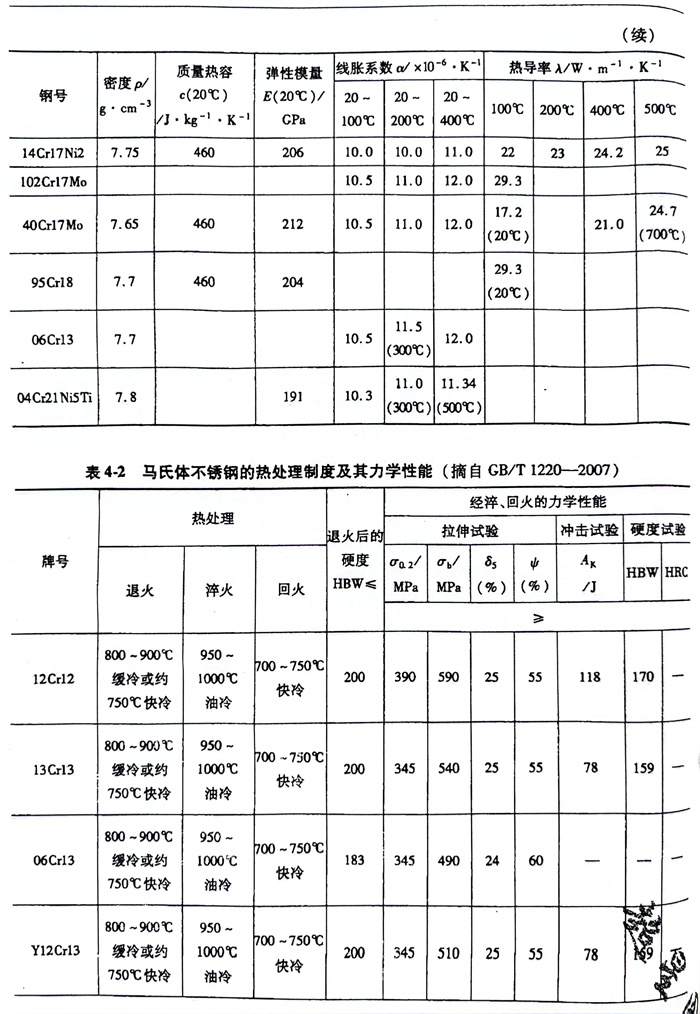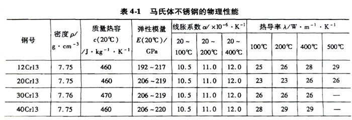 馬氏體不銹鋼管(guan)的工藝性能在鋼種介紹中都有詳細的闡述,這里僅介紹一下馬氏體不銹鋼的物理性能(見表4-1),以及熱處理制度和力學性能(見表4-2)。