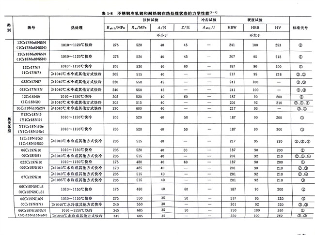 18-8型不銹(xiu)鋼(gang)(gang)不僅在(zai)(zai)低溫時具(ju)有良好(hao)的(de)(de)力學性(xing)能,而(er)且在(zai)(zai)高(gao)溫時又有較高(gao)的(de)(de)熱強性(xing)(見(jian)表(biao)1-9、表(biao)1-10)。它(ta)在(zai)(zai)900℃的(de)(de)氧(yang)化(hua)性(xing)介質(zhi)和在(zai)(zai)700℃的(de)(de)還原性(xing)介質(zhi)中,都(dou)能保(bao)持其化(hua)學穩定性(xing),所以(yi)這(zhe)種鋼(gang)(gang)也(ye)是常用的(de)(de)耐熱材料。