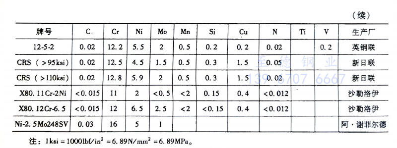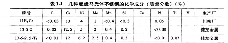 該類馬氏(shi)體(ti)不(bu)(bu)(bu)銹鋼(gang)(gang)(gang)是(shi)(shi)在Cr13和(he)Cr17鋼(gang)(gang)(gang)的(de)(de)(de)基礎上適當降低碳含(han)量(w(C)<0.03%)和(he)硫含(han)量(<0.01%),增(zeng)加鎳含(han)量.5%)和(he)(w(Ni)=4.0%~6.5%)鉬(mu)含(han)量(w(Mo)≤2.5%),從而改善鋼(gang)(gang)(gang)的(de)(de)(de)韌性(xing)、耐蝕性(xing)和(he)焊接性(xing)能,特別(bie)是(shi)(shi)在含(han)H2S和(he)CO2氣(qi)氛中(zhong)的(de)(de)(de)性(xing)能,可(ke)用于石油化工(gong)、天然氣(qi)的(de)(de)(de)儲運裝置(zhi)。同(tong)時,超(chao)級馬氏(shi)體(ti)不(bu)(bu)(bu)銹鋼(gang)(gang)(gang)可(ke)以代替奧氏(shi)體(ti)-鐵(tie)素體(ti)雙(shuang)相不(bu)(bu)(bu)銹鋼(gang)(gang)(gang)制作結構(gou)件,因為強度高(gao),可(ke)以減(jian)少零件的(de)(de)(de)壁厚,減(jian)輕(qing)零件的(de)(de)(de)重量,節約成本。國外研發的(de)(de)(de)幾種超(chao)級馬氏(shi)體(ti)不(bu)(bu)(bu)銹鋼(gang)(gang)(gang)的(de)(de)(de)化學成分見表(biao)1-1。