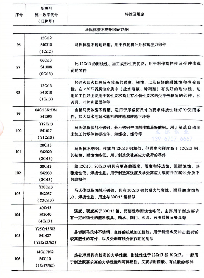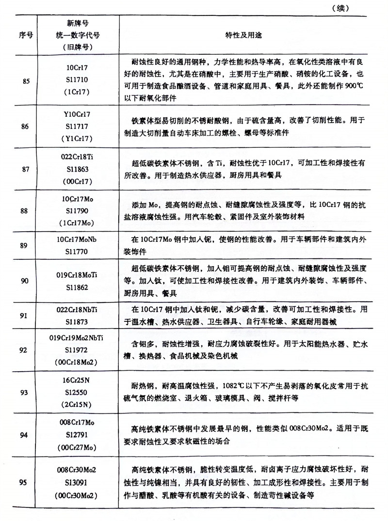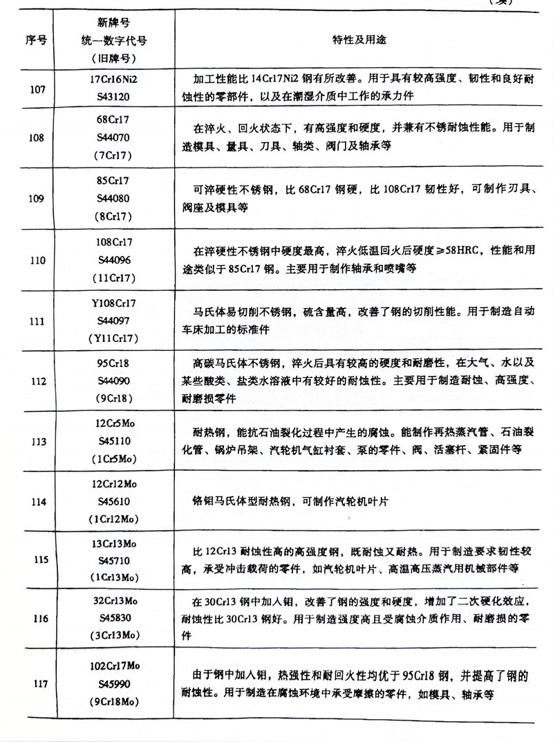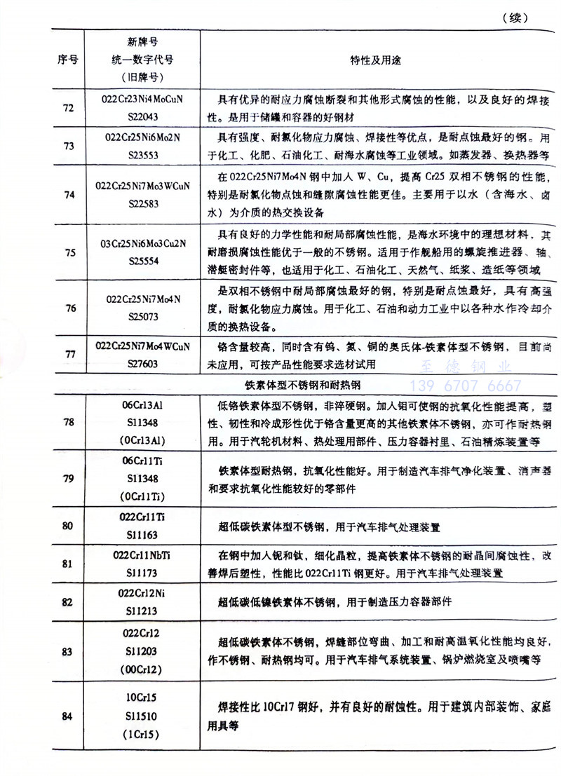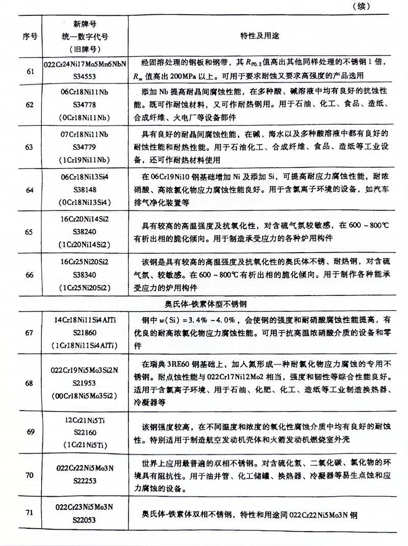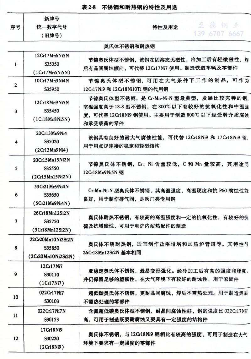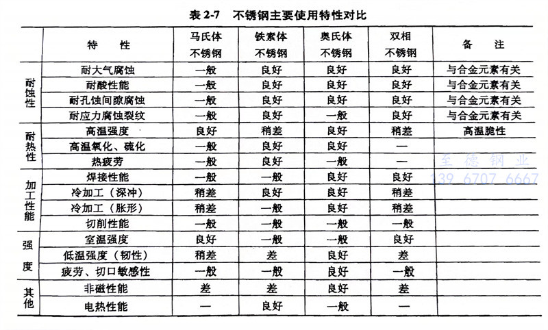 不銹鋼的選擇在大的方面可根據前面的方法選用。對于具體選擇哪一種不(bu)銹鋼(gang),還應根據每一個不銹鋼鋼種的基本特性和相關因素來選擇適合生產需要、經濟上合理、技術上先進的不銹鋼。下面簡要介紹各類不銹鋼使用特性對比(見表2-7)、以及每種不銹鋼和耐熱鋼(gang)的特性和用途(見表2-8),供選擇時參考。