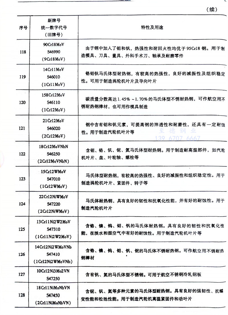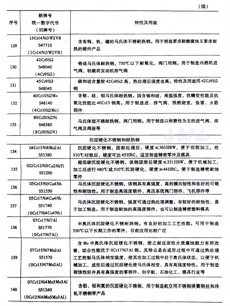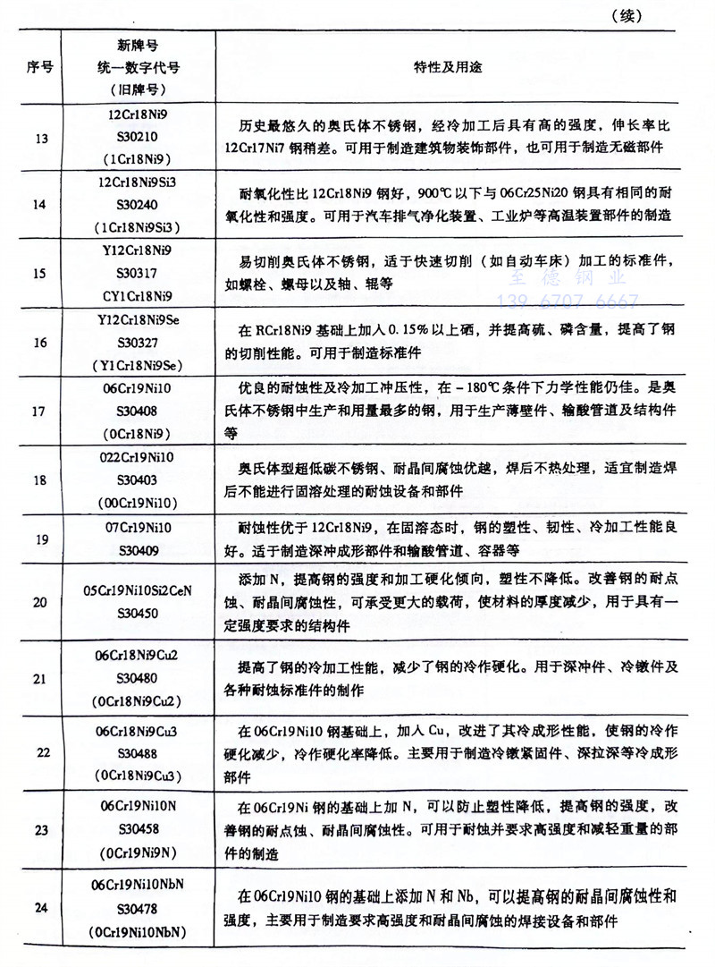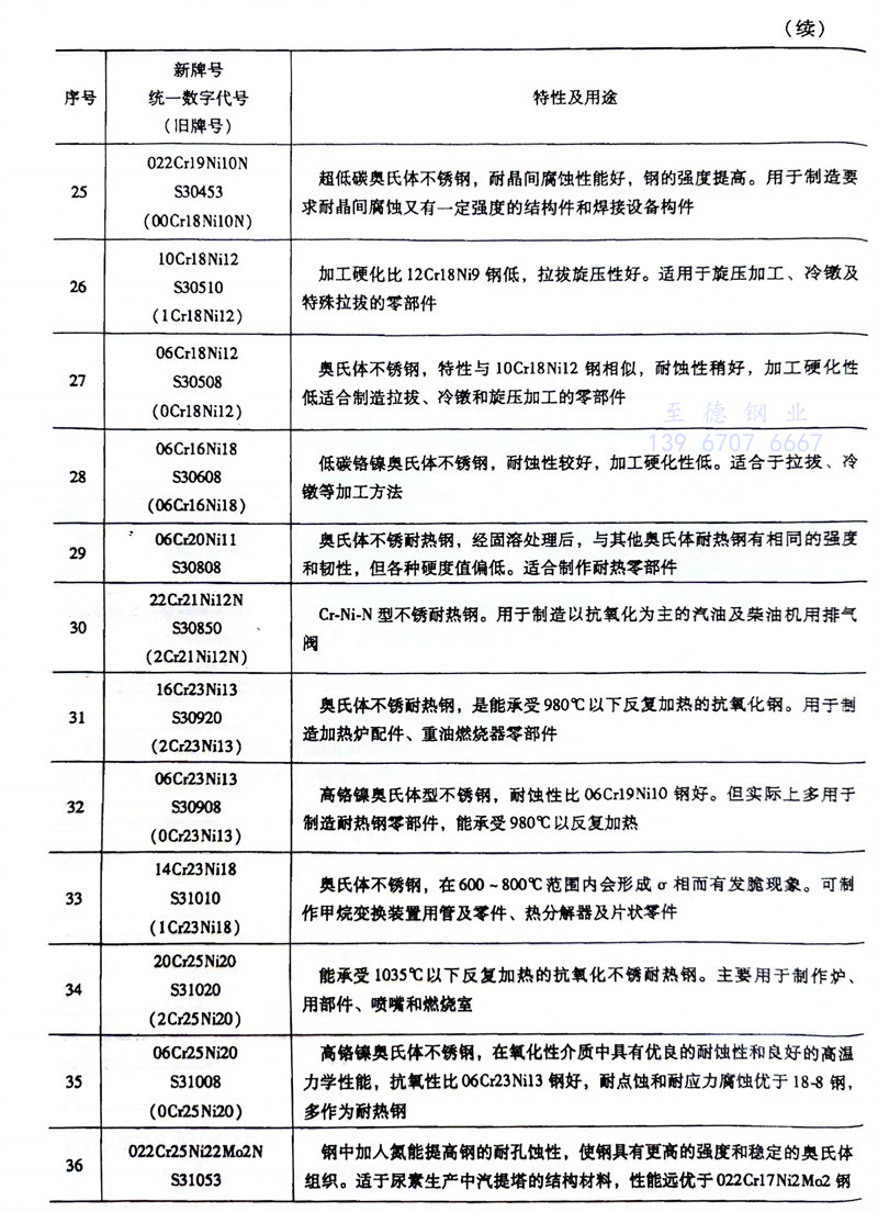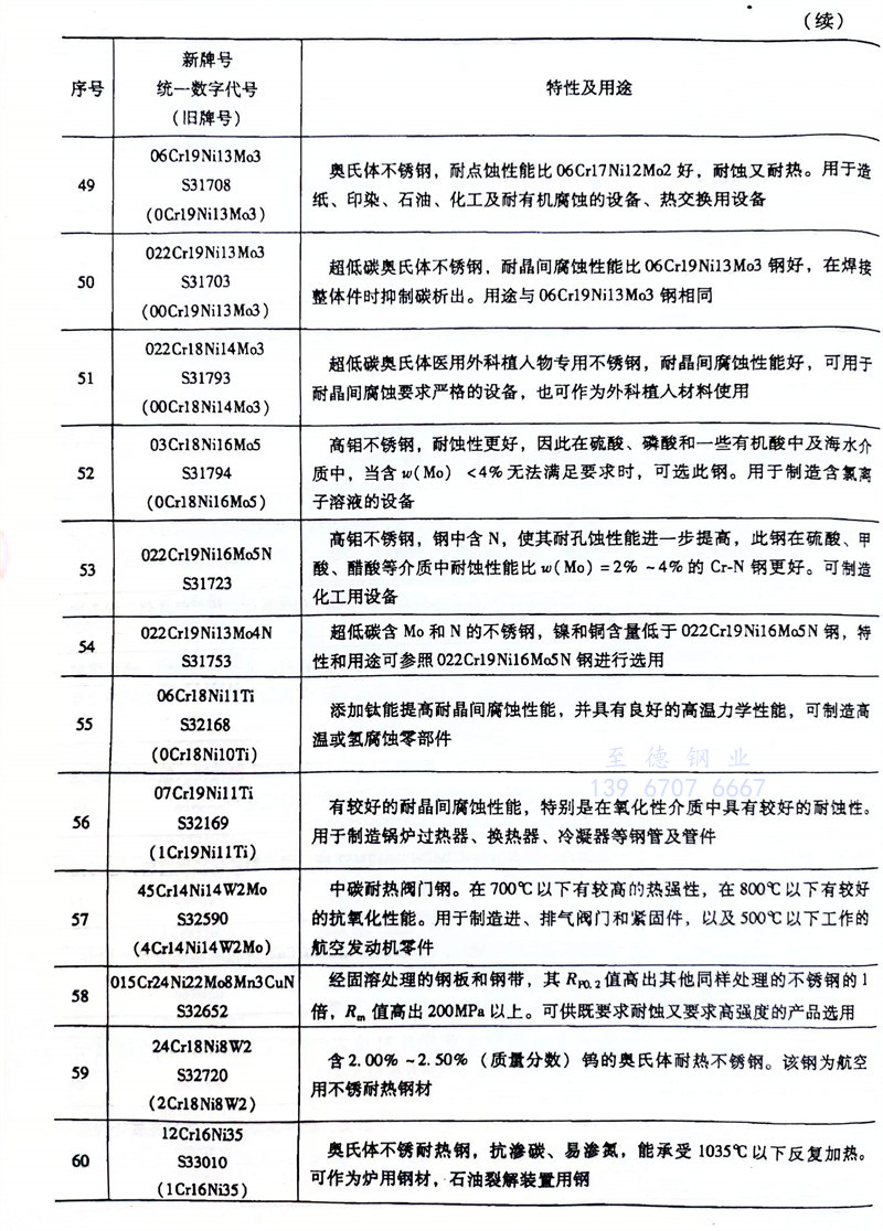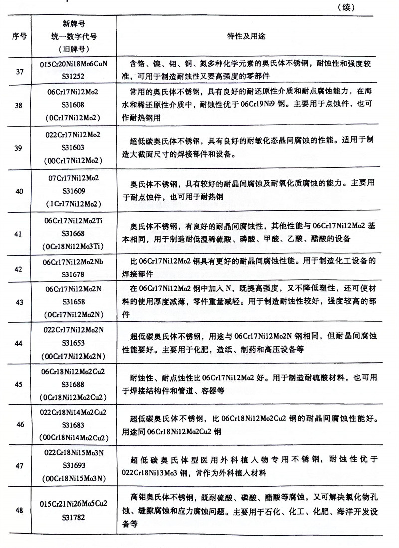 不銹鋼的選擇在大的方面可根據前面的方法選用。對于具體選擇哪一種不(bu)銹鋼(gang),還應根據每一個不銹鋼鋼種的基本特性和相關因素來選擇適合生產需要、經濟上合理、技術上先進的不銹鋼。下面簡要介紹各類不銹鋼使用特性對比(見表2-7)、以及每種不銹鋼和耐熱鋼(gang)的特性和用途(見表2-8),供選擇時參考。