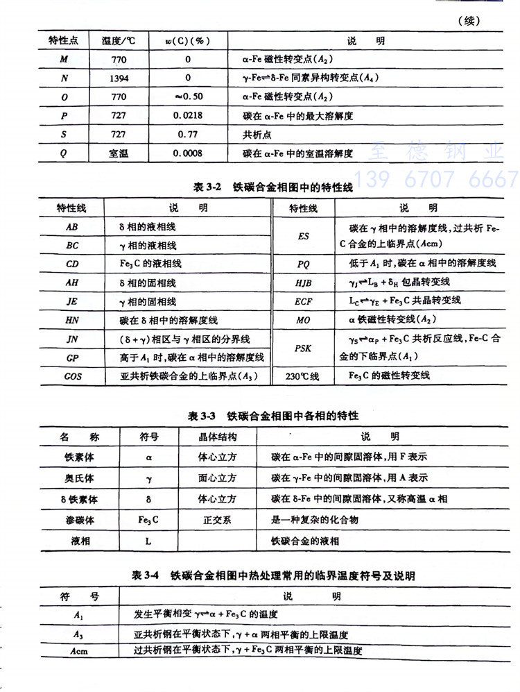 為了便于(yu)查閱應(ying)用,現將鐵(tie)碳(tan)合金相(xiang)圖(tu)中(zhong)各點、線及其各種相(xiang)的特性分別列于(yu)表3-1~表3-4。