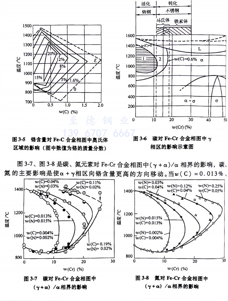 圖(tu)(tu)3-7、圖(tu)(tu)3-8是碳(tan)(tan)、氮元素(su)對(dui)Fe-Cr合金相(xiang)(xiang)圖(tu)(tu)中(γ+α)/α相(xiang)(xiang)界的(de)影響(xiang),碳(tan)(tan)、氮的(de)主要影響(xiang)是使α+γ相(xiang)(xiang)區(qu)向(xiang)(xiang)鉻含量更高的(de)方(fang)向(xiang)(xiang)移動。當(dang)(dang)w(C)=0.013%,w(N)=0.015%時,Fe-Cr合金相(xiang)(xiang)圖(tu)(tu)中α+γ雙相(xiang)(xiang)區(qu)的(de)位置(zhi)從w(Cr)=13%移到了(Cr)=17%;而當(dang)(dang)w(C)=0.04%w(N)=0.03%時,Fe-Cr合金相(xiang)(xiang)圖(tu)(tu)中α+γ雙相(xiang)(xiang)區(qu)則(ze)移到w(Cr)=21%;而當(dang)(dang)w(C)=0.19%w(N)=0.02%時,則(ze)可移至w(Cr)=26%處。另外,碳(tan)(tan)和氮還(huan)使α+γ雙相(xiang)(xiang)區(qu)最寬(kuan)位置(zhi)向(xiang)(xiang)高的(de)溫度方(fang)向(xiang)(xiang)移動。