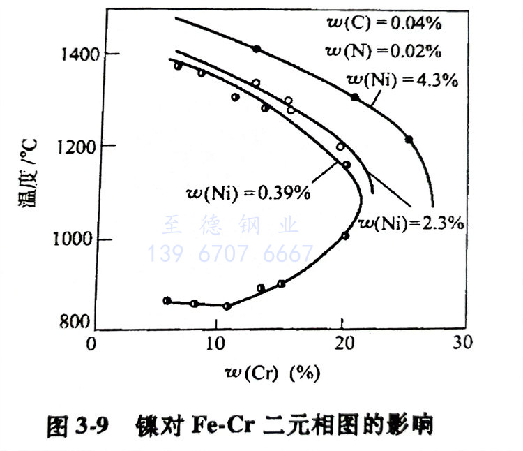 圖3-9是鎳(nie)對Fe-Crr二元相(xiang)(xiang)圖的(de)(de)影響,鎳(nie)的(de)(de)作用與碳(tan)、氮相(xiang)(xiang)似,也可擴大α+γγ相(xiang)(xiang)區的(de)(de)范圍(wei)。從圖3-9中(zhong)可以明顯看(kan)出(chu),當碳(tan)、氮含量(liang)一(yi)定時,隨著(zhu)鎳(nie)含量(liang)的(de)(de)增加,Fe-Cr相(xiang)(xiang)圖中(zhong)的(de)(de)α+γ相(xiang)(xiang)區的(de)(de)范圍(wei)向著(zhu)鉻含量(liang)更高的(de)(de)位置和更高的(de)(de)溫(wen)度方向移動。