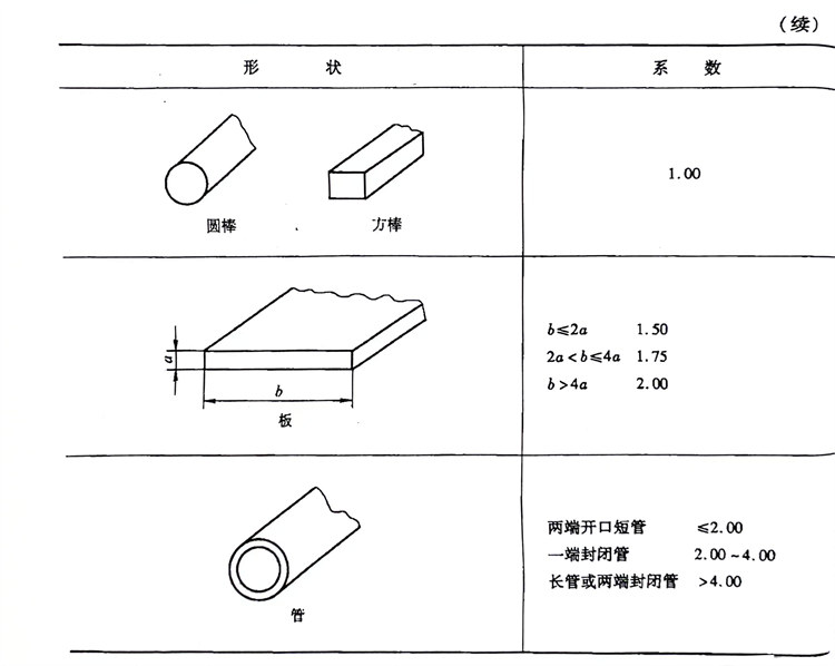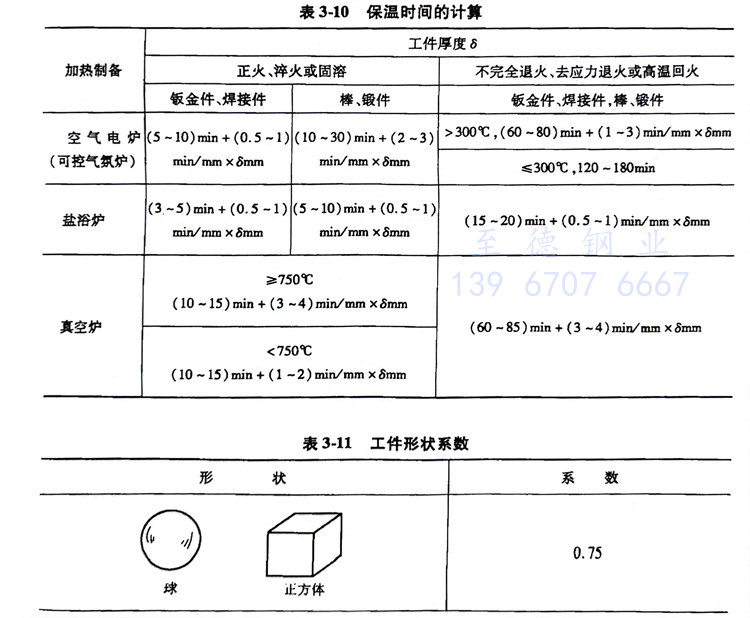 根據工(gong)件(jian)的材料以及對表面質量的要求,應正確選用(yong)加熱(re)設(she)備、加熱(re)介(jie)質和加熱(re)方(fang)法。對有(you)回(hui)槽(cao)和不(bu)(bu)通孔(kong)的工(gong)件(jian)、鑄件(jian)和焊(han)接件(jian)以及加工(gong)成形(xing)的不(bu)(bu)銹鋼工(gong)件(jian),一般不(bu)(bu)宜(yi)在鹽浴中加熱(re)。工(gong)件(jian)加熱(re)應有(you)足夠的保(bao)溫(wen)時間(jian)。可根據工(gong)件(jian)的有(you)效(xiao)厚度和條件(jian)厚度(實際厚度乘以工(gong)件(jian)形(xing)狀(zhuang)系數),參照表3-10和表3-11進行計(ji)算。