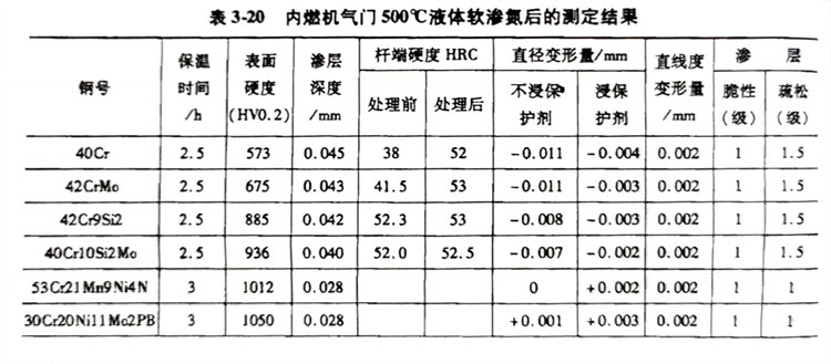 該工藝(yi)與QPQ工藝(yi)、商業鹽(yan)J-2、TF-1工藝(yi)相同(tong)。氣門經低溫(wen)無毒鹽(yan)浴共滲(500℃×3h)和氧化(hua)復合處理(在(zai)160℃的氧化(hua)劑(ji)中保溫(wen)20min)后,其(qi)耐蝕(shi)性(xing)和外觀質(zhi)量優異(yi),硬度均在(zai)50HRC以上,變形(xing)小(xiao)。內(nei)燃機氣門500℃液體軟滲氮后的測定結果(guo)見表3-20。