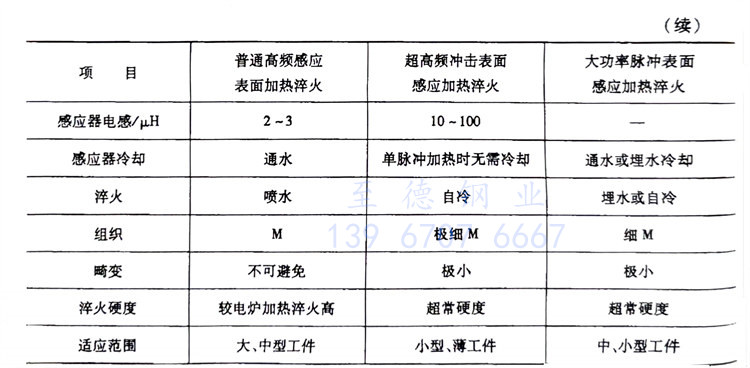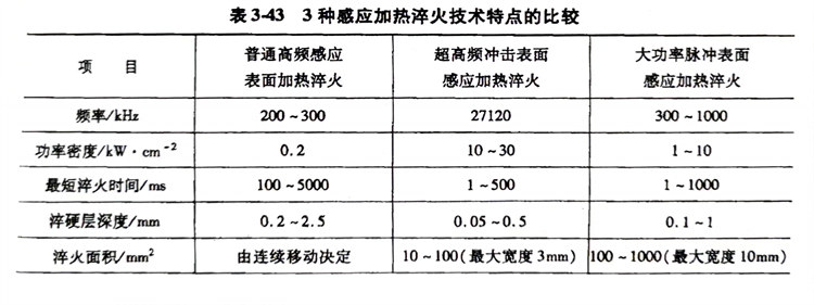 高頻(pin)感(gan)應加(jia)(jia)熱向著超高沖(chong)(chong)擊(ji)淬(cui)火(huo)和大(da)功率脈(mo)沖(chong)(chong)感(gan)應加(jia)(jia)熱淬(cui)火(huo)的方向發展。表3-43是(shi)普通高頻(pin)感(gan)應表面加(jia)(jia)熱淬(cui)火(huo)、超高頻(pin)沖(chong)(chong)擊(ji)表面感(gan)應加(jia)(jia)熱淬(cui)火(huo)、大(da)功率脈(mo)沖(chong)(chong)表面感(gan)應加(jia)(jia)熱淬(cui)火(huo)的技術特點比較(jiao)。