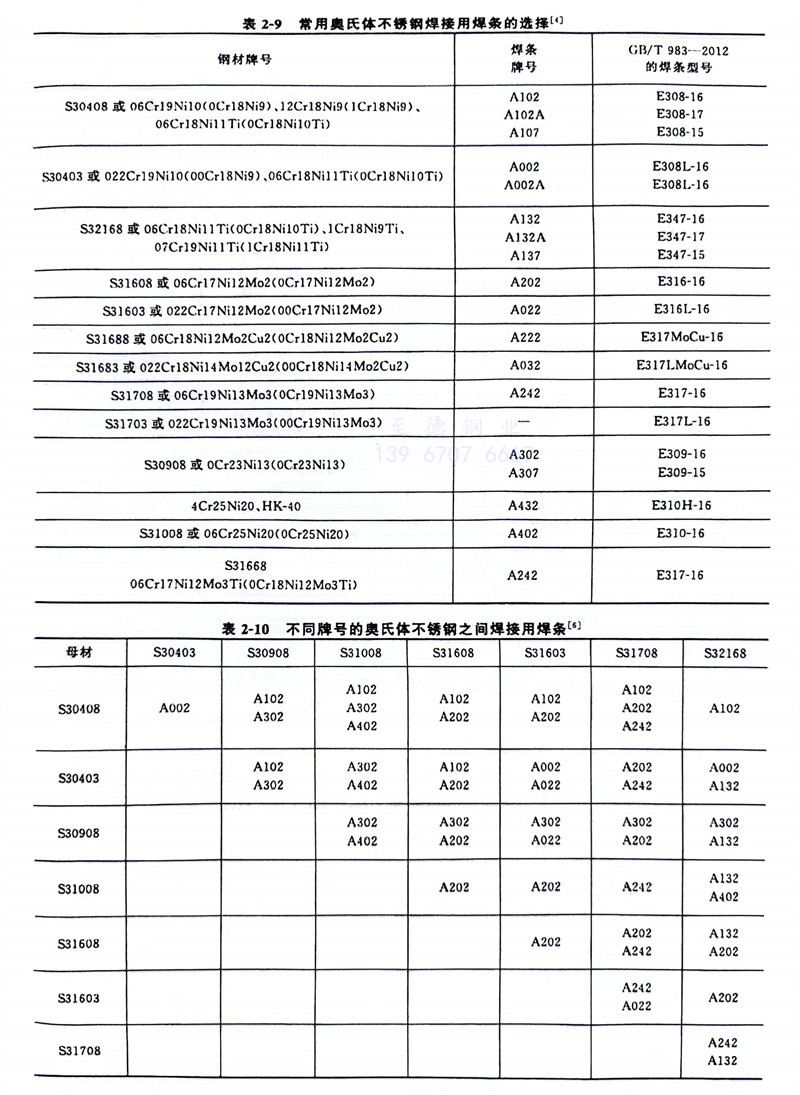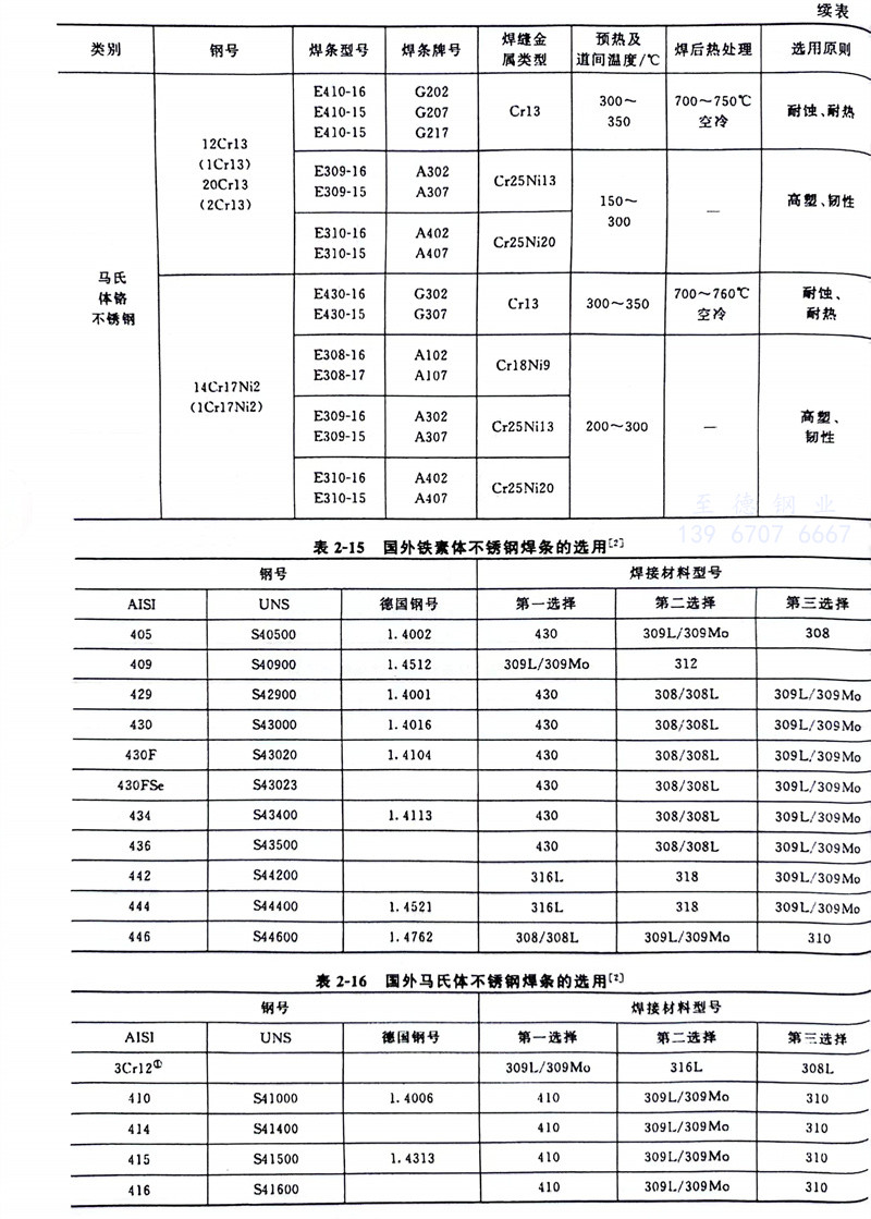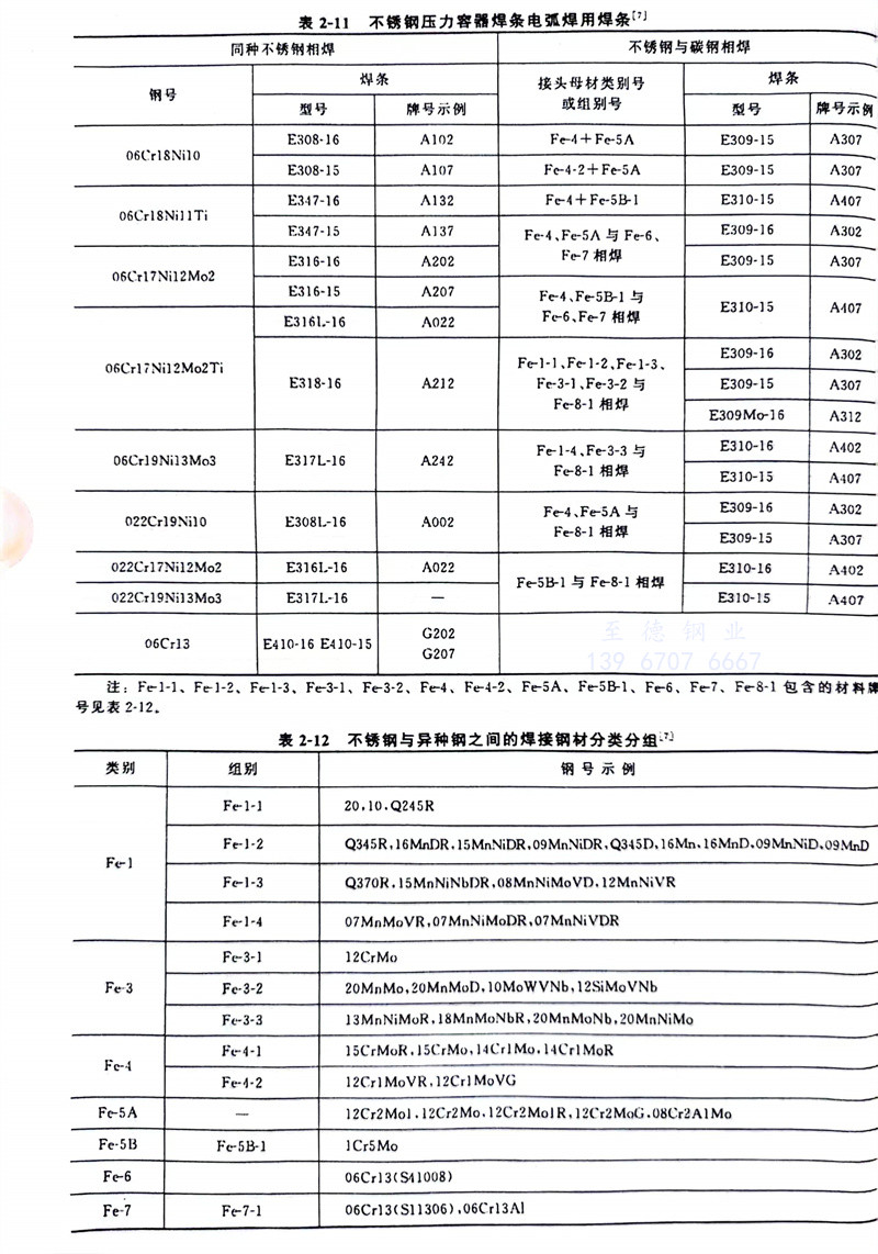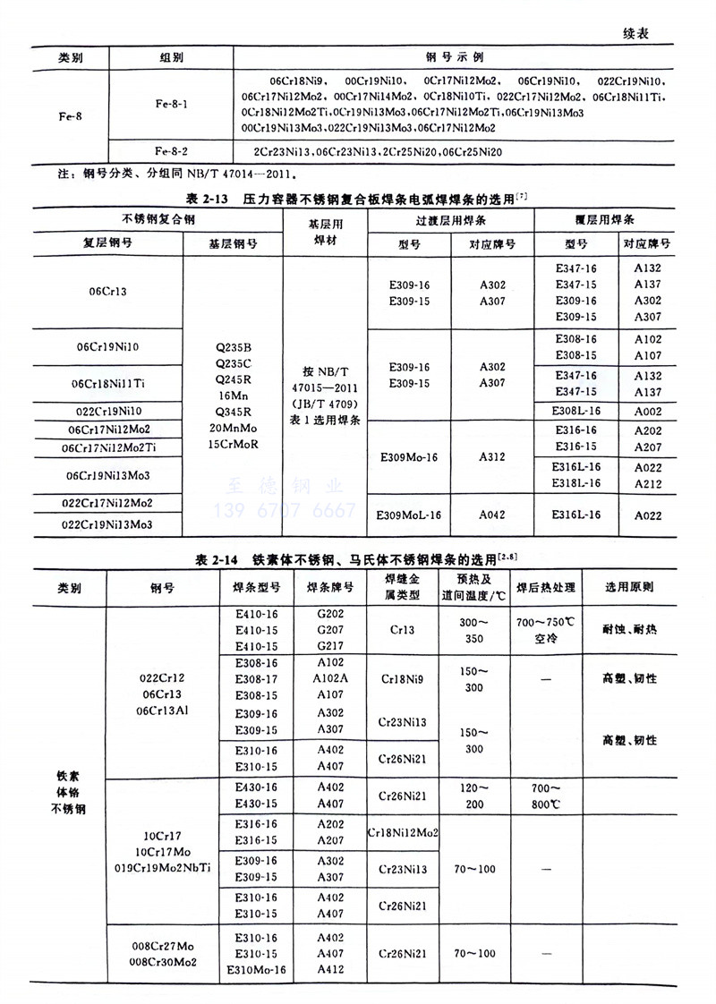 不(bu)(bu)銹(xiu)鋼(gang)(gang)(gang)(gang)(gang)(gang)焊(han)(han)(han)(han)條(tiao)的(de)(de)(de)選擇(ze)見表2-5(含(han)力學性能和熱處理(li)要(yao)求(qiu))、表2-6(含(han)焊(han)(han)(han)(han)條(tiao)牌(pai)號(hao)與型號(hao)的(de)(de)(de)對應關(guan)系)、表2-8(不(bu)(bu)銹(xiu)鋼(gang)(gang)(gang)(gang)(gang)(gang)與異(yi)種鋼(gang)(gang)(gang)(gang)(gang)(gang)的(de)(de)(de)焊(han)(han)(han)(han)接(jie)焊(han)(han)(han)(han)條(tiao)的(de)(de)(de)選擇(ze)原(yuan)則)、表2-9(適(shi)(shi)(shi)用(yong)于(yu)奧(ao)氏(shi)體(ti)不(bu)(bu)銹(xiu)鋼(gang)(gang)(gang)(gang)(gang)(gang)之(zhi)間的(de)(de)(de)焊(han)(han)(han)(han)接(jie))、表2-10(適(shi)(shi)(shi)用(yong)于(yu)不(bu)(bu)同牌(pai)號(hao)的(de)(de)(de)奧(ao)氏(shi)體(ti)不(bu)(bu)銹(xiu)鋼(gang)(gang)(gang)(gang)(gang)(gang)之(zhi)間的(de)(de)(de)焊(han)(han)(han)(han)接(jie))、表2-11(不(bu)(bu)銹(xiu)鋼(gang)(gang)(gang)(gang)(gang)(gang)壓力容器焊(han)(han)(han)(han)條(tiao)電(dian)弧焊(han)(han)(han)(han)用(yong)焊(han)(han)(han)(han)條(tiao)選擇(ze))、表2-13(適(shi)(shi)(shi)用(yong)于(yu)焊(han)(han)(han)(han)接(jie)不(bu)(bu)銹(xiu)鋼(gang)(gang)(gang)(gang)(gang)(gang)復合板時焊(han)(han)(han)(han)條(tiao)的(de)(de)(de)選用(yong))、表2-14(鐵(tie)素體(ti)不(bu)(bu)銹(xiu)鋼(gang)(gang)(gang)(gang)(gang)(gang)、馬(ma)氏(shi)體(ti)不(bu)(bu)銹(xiu)鋼(gang)(gang)(gang)(gang)(gang)(gang)焊(han)(han)(han)(han)接(jie)用(yong)焊(han)(han)(han)(han)條(tiao)),不(bu)(bu)銹(xiu)鋼(gang)(gang)(gang)(gang)(gang)(gang)與異(yi)種鋼(gang)(gang)(gang)(gang)(gang)(gang)之(zhi)間的(de)(de)(de)焊(han)(han)(han)(han)接(jie)鋼(gang)(gang)(gang)(gang)(gang)(gang)材分(fen)類(lei)分(fen)組(zu)見表2-12。國外鐵(tie)素體(ti)不(bu)(bu)銹(xiu)鋼(gang)(gang)(gang)(gang)(gang)(gang)焊(han)(han)(han)(han)條(tiao)的(de)(de)(de)選用(yong)見表2-15,國外馬(ma)氏(shi)體(ti)不(bu)(bu)銹(xiu)鋼(gang)(gang)(gang)(gang)(gang)(gang)焊(han)(han)(han)(han)條(tiao)的(de)(de)(de)選用(yong)見表2-16。