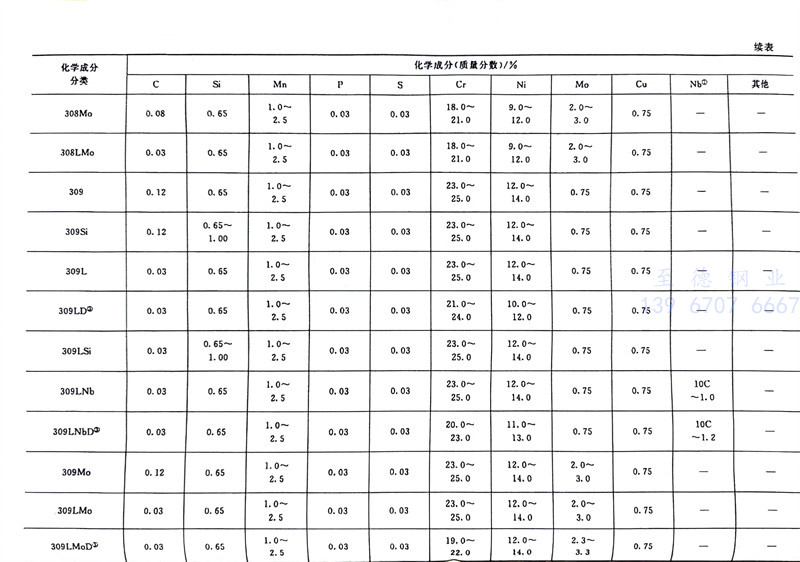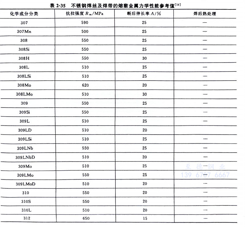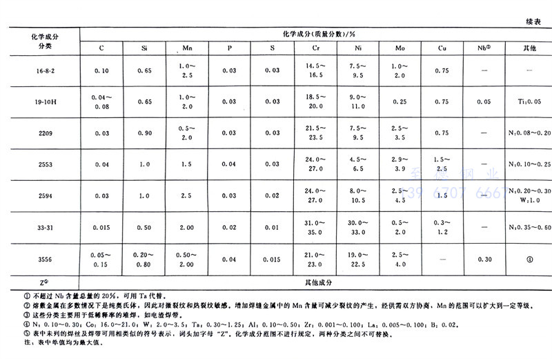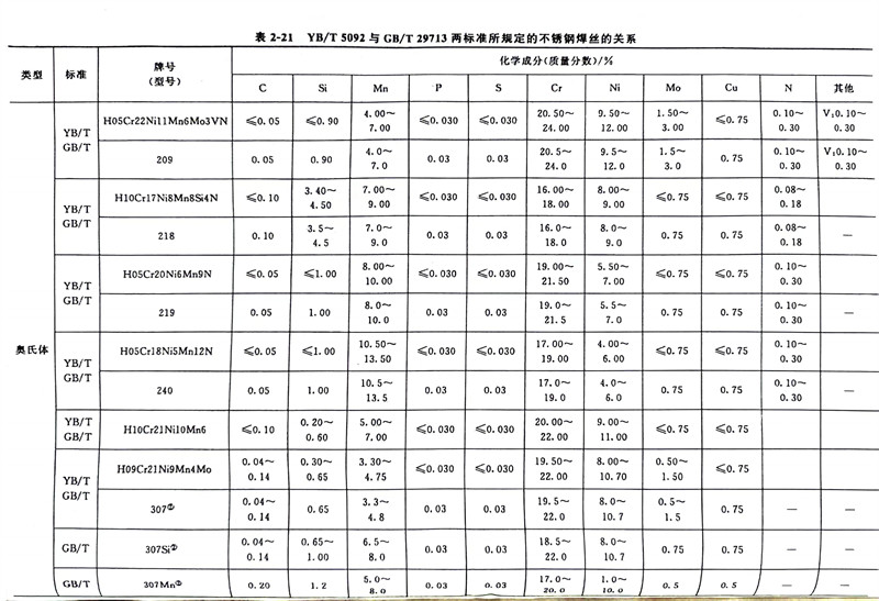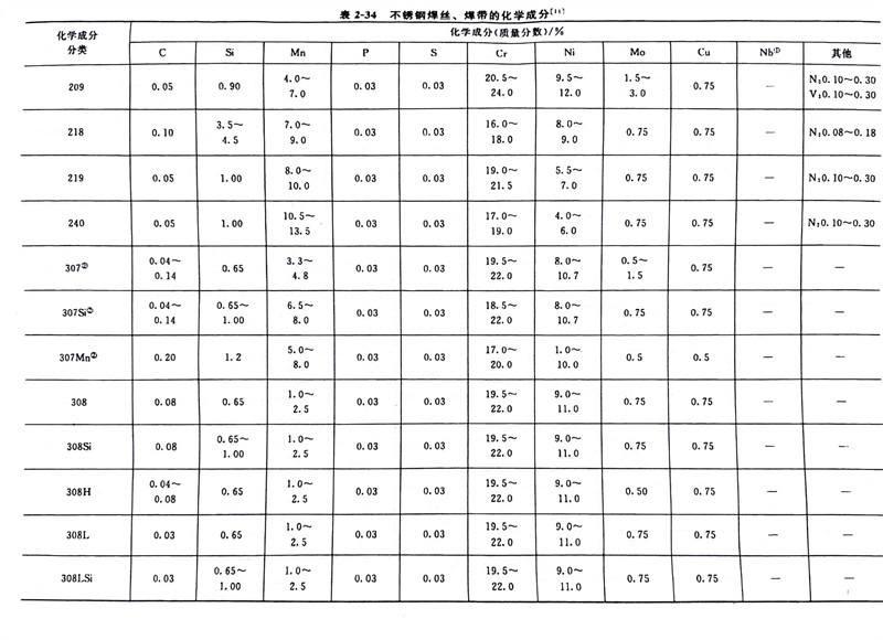 GB/T 29713-2013《不銹鋼(gang)焊絲和焊帶》標準規定的不銹鋼焊絲及焊帶的化學成分與YB/T 5092-2005《焊接用不銹鋼焊絲》規定的焊絲的化學成分非常接近。它們之間的詳細對比見表2-21。GB/T 29713-2013標準適用于熔化極氣體保護電弧焊、非熔化極氣體保護電弧焊、埋弧焊、電渣焊、等離子弧焊及激光焊等用不銹鋼焊絲、填充絲及焊帶。該標準規定的焊絲、焊帶化學成分見表2-34(該表列出的為焊絲型號、該標準的焊絲與焊帶的化學成分一致),力學性能參見表2-35。
