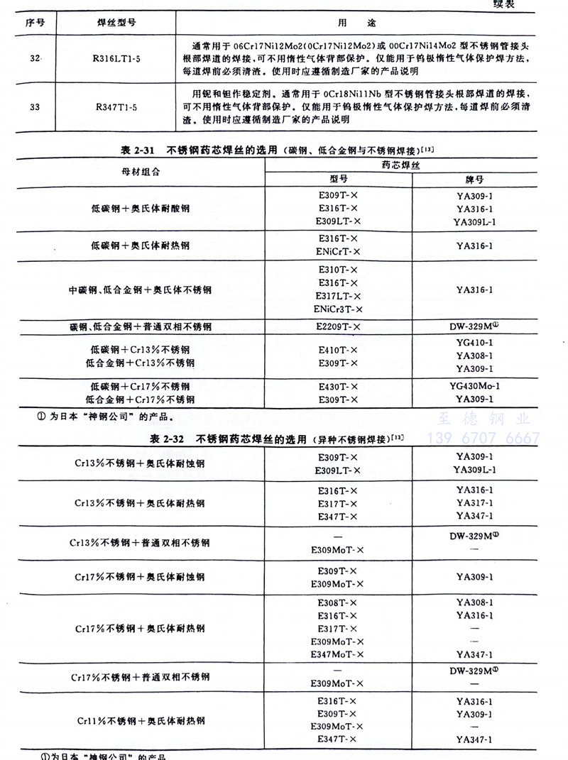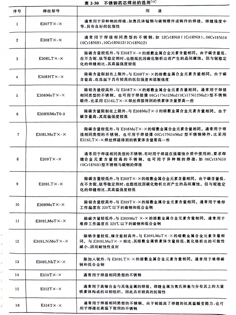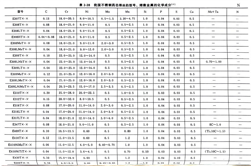 我國(guo)不(bu)銹(xiu)鋼藥芯焊(han)絲的(de)(de)型(xing)號、熔(rong)敷金屬的(de)(de)化學成分見表2-28,不(bu)銹(xiu)鋼藥芯焊(han)絲的(de)(de)拉伸性能及焊(han)后(hou)熱處理要求見表2-29,不(bu)銹(xiu)鋼藥芯焊(han)絲的(de)(de)選(xuan)用見表2-30~表2-33。